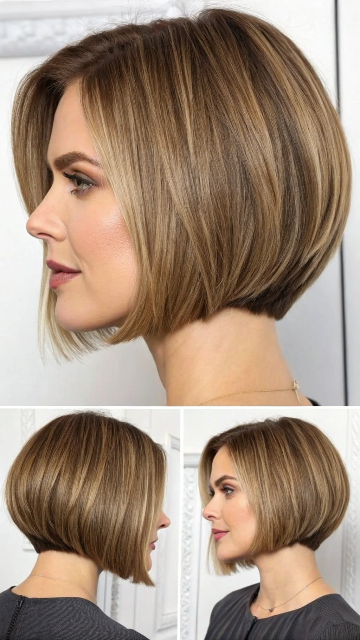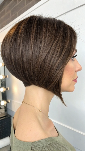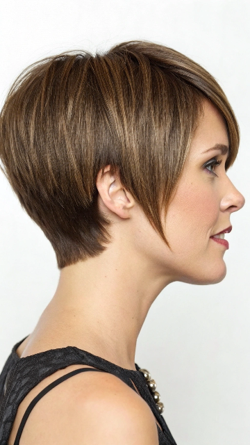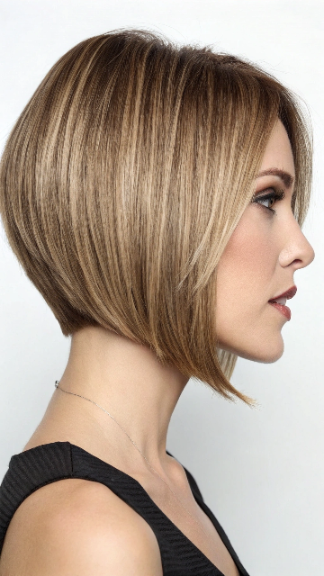 An inverted bob stacks layers at the back. Layers shorten toward the nape. It elongates the neck.