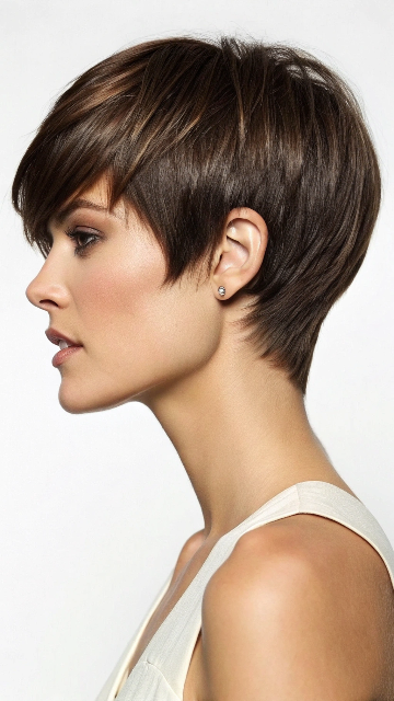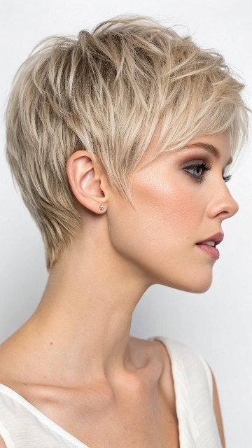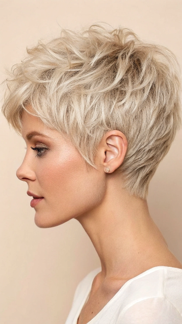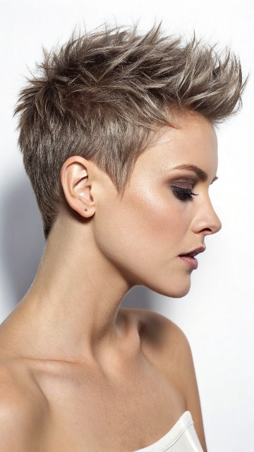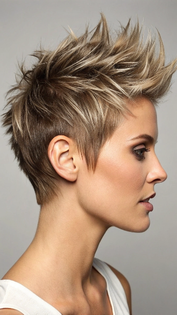 The spiky pixie points layers upward. Layers vary lengths for spikes. It energizes the look.