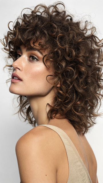 The curly shag piles layers to amplify curls. Layers separate coils for bounce. It vibrates with energy.