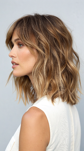 A shaggy lob reaches the shoulders with uneven layers. The layers frame the face softly. It gives a relaxed vibe.