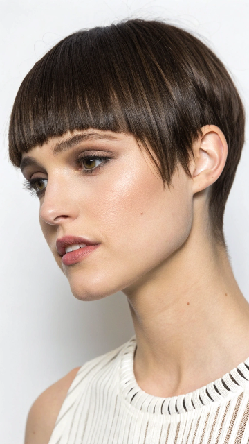 The French crop fringes forward with top layers. Layers add subtle lift. Bangs blend in.
