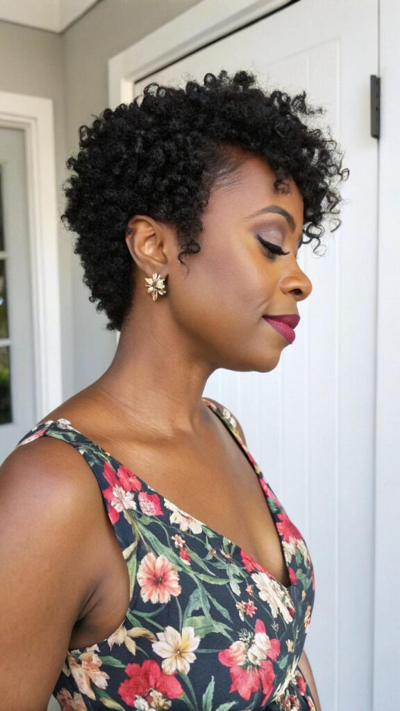 The curly pixie with undercut is a bold and edgy style for short natural hair. This look features tight curls on top with a shaved or closely cut undercut for a striking contrast. It’s a statement-making hairstyle that’s perfect for women who love to experiment.