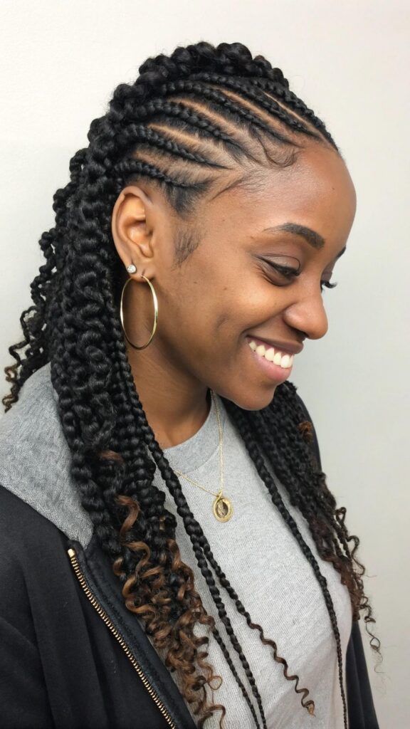Use a styling gel to keep your cornrows neat and defined. You can add beads or cuffs to the ends for a personalized touch. Cornrows with curls are perfect for protecting your hair while still looking chic.