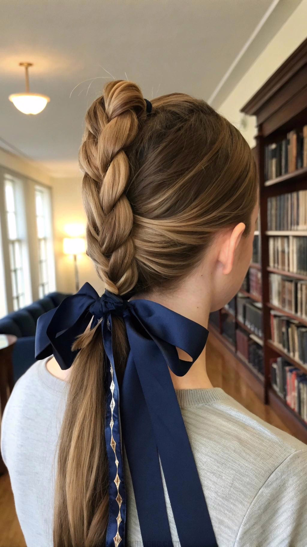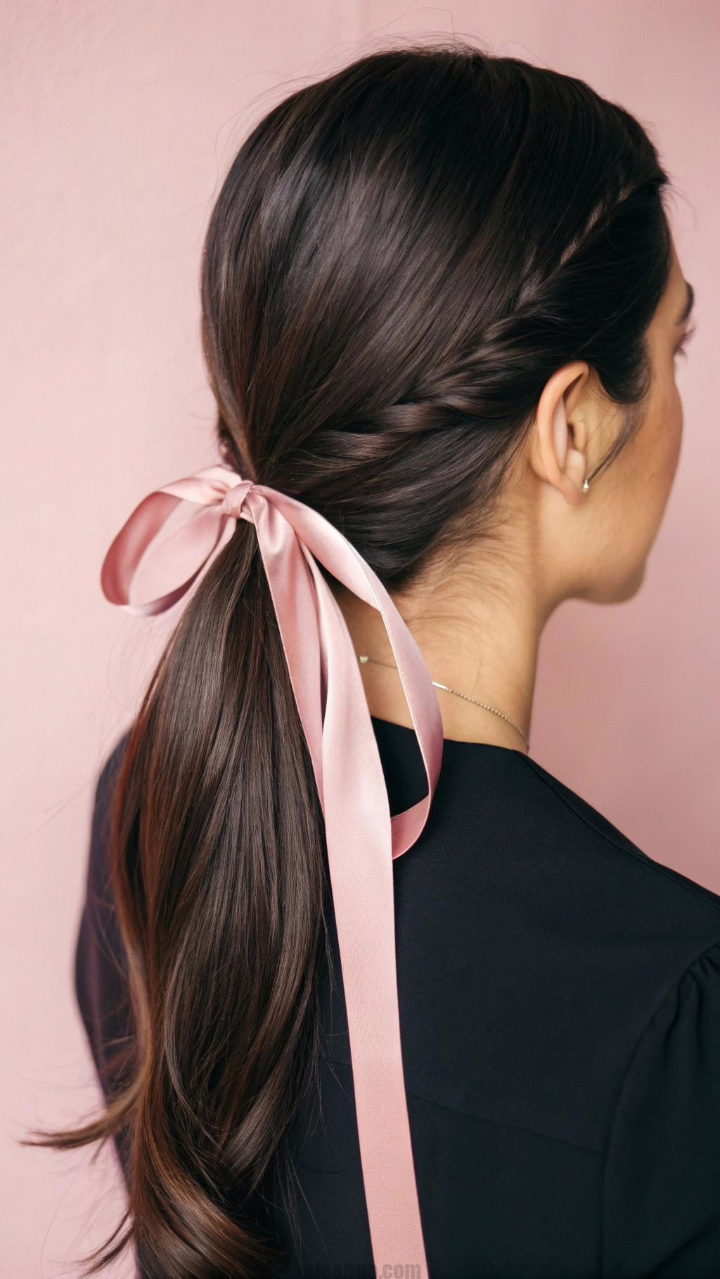 This style looks polished yet relaxed. Add a satin ribbon that matches your dress color. The twisted detail elevates a basic ponytail beautifully.