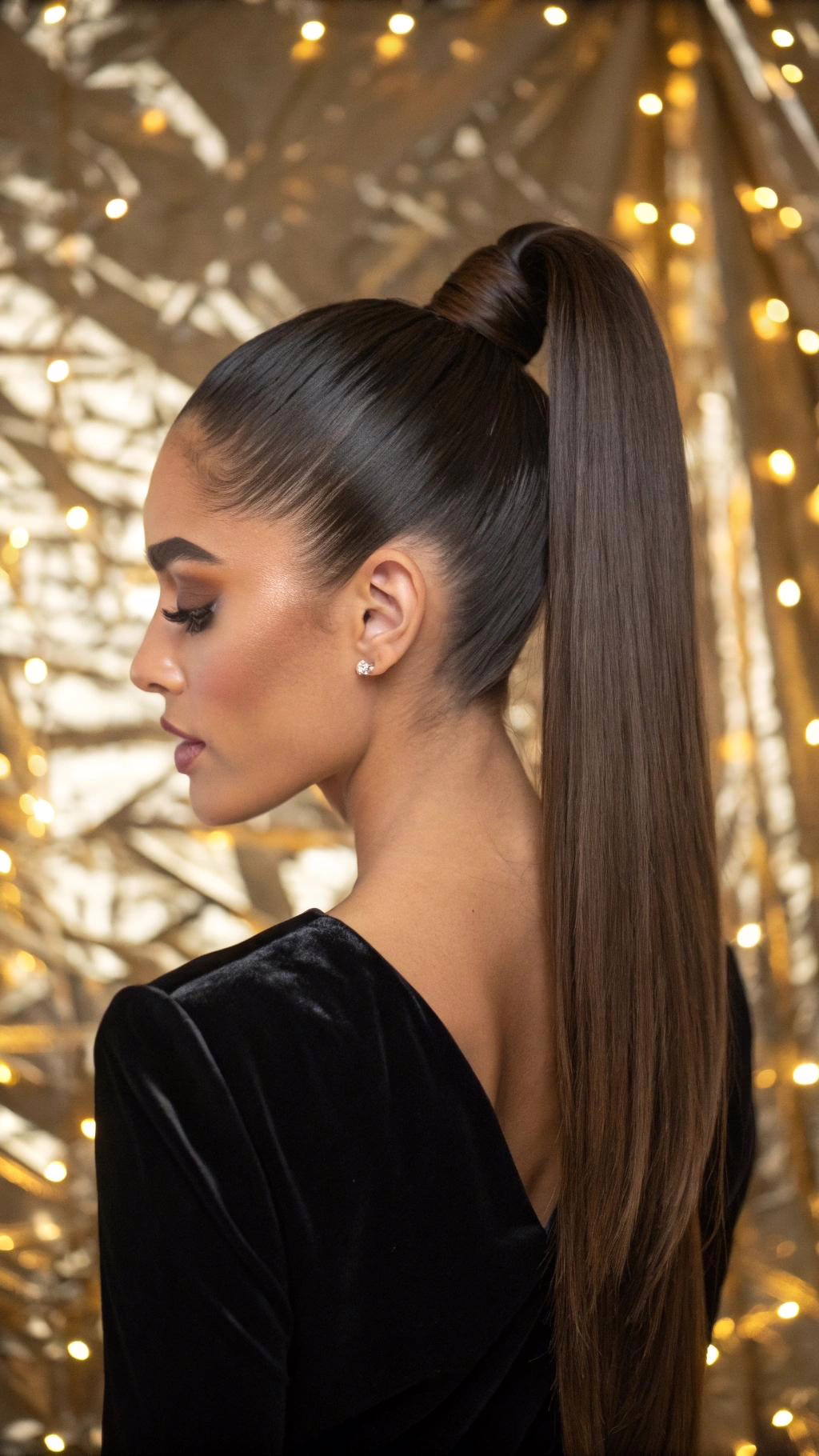 Ultra-sleek and office-to-evening ready. Straighten hair completely for this look. Create a low ponytail at the nape.