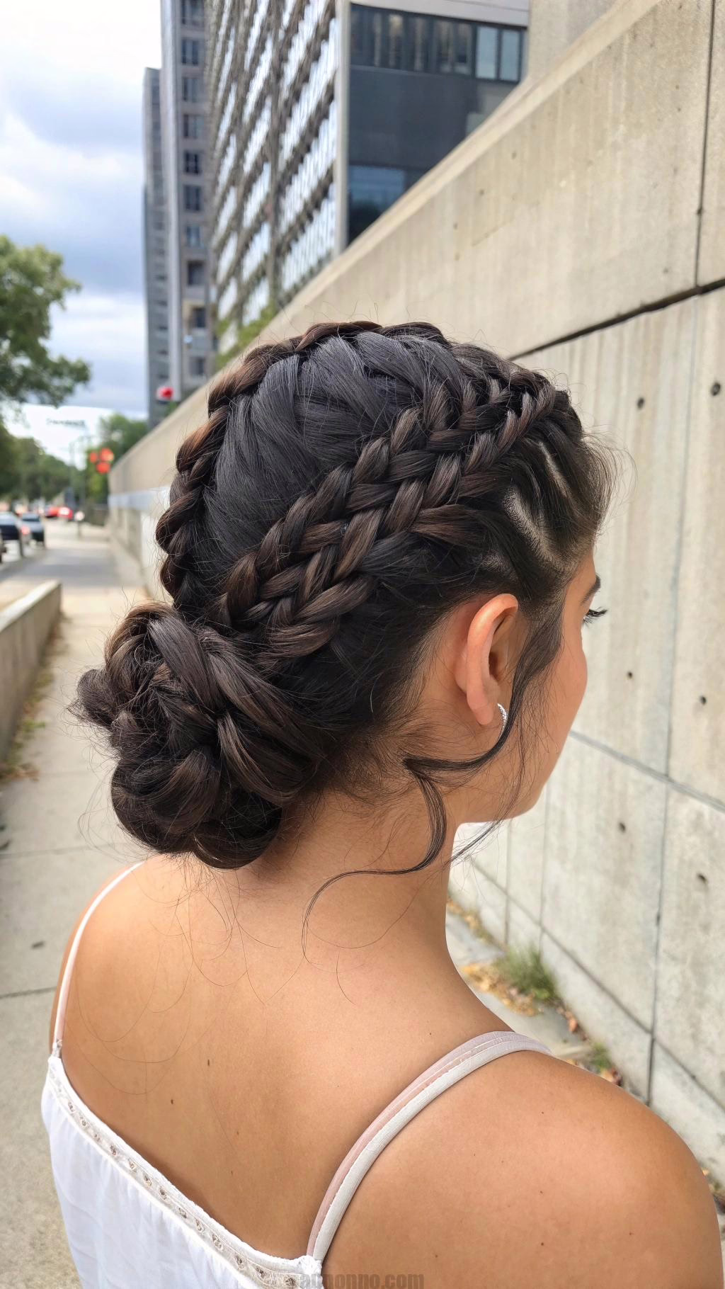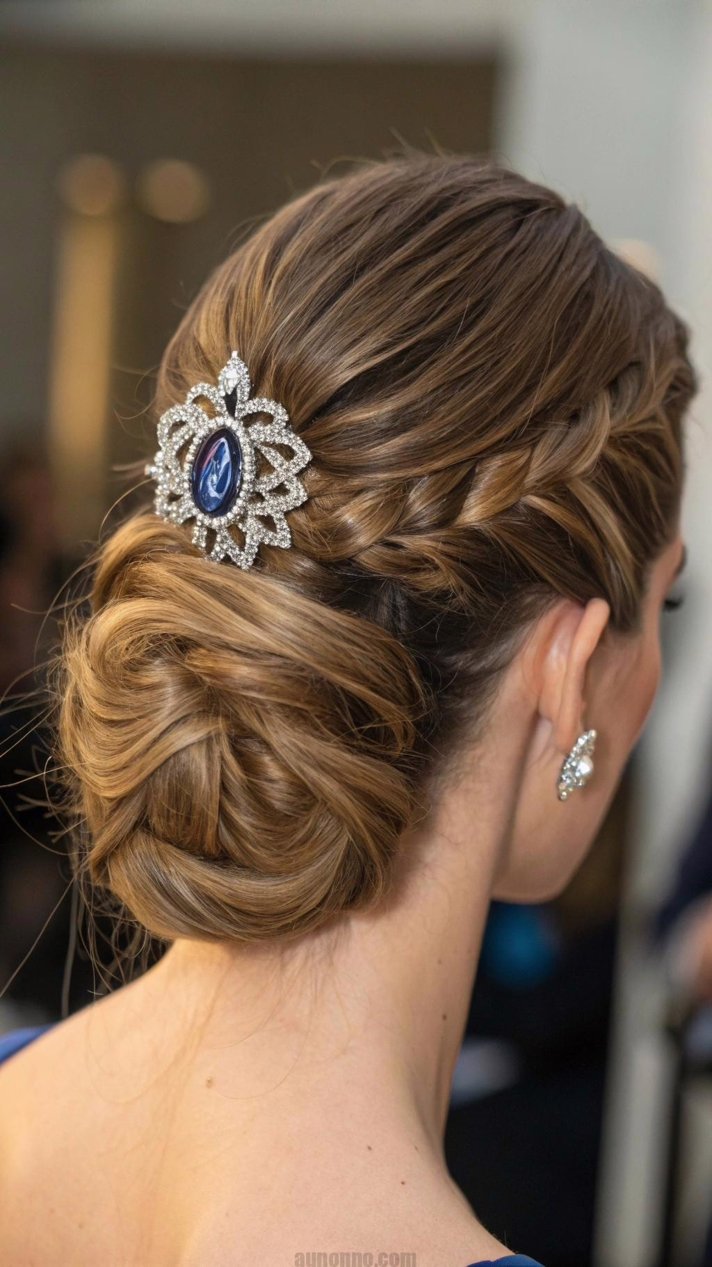 The double bun effect looks high-end. Add a jeweled hairpin where the twists meet. Perfect for showing off a backless dress detail.