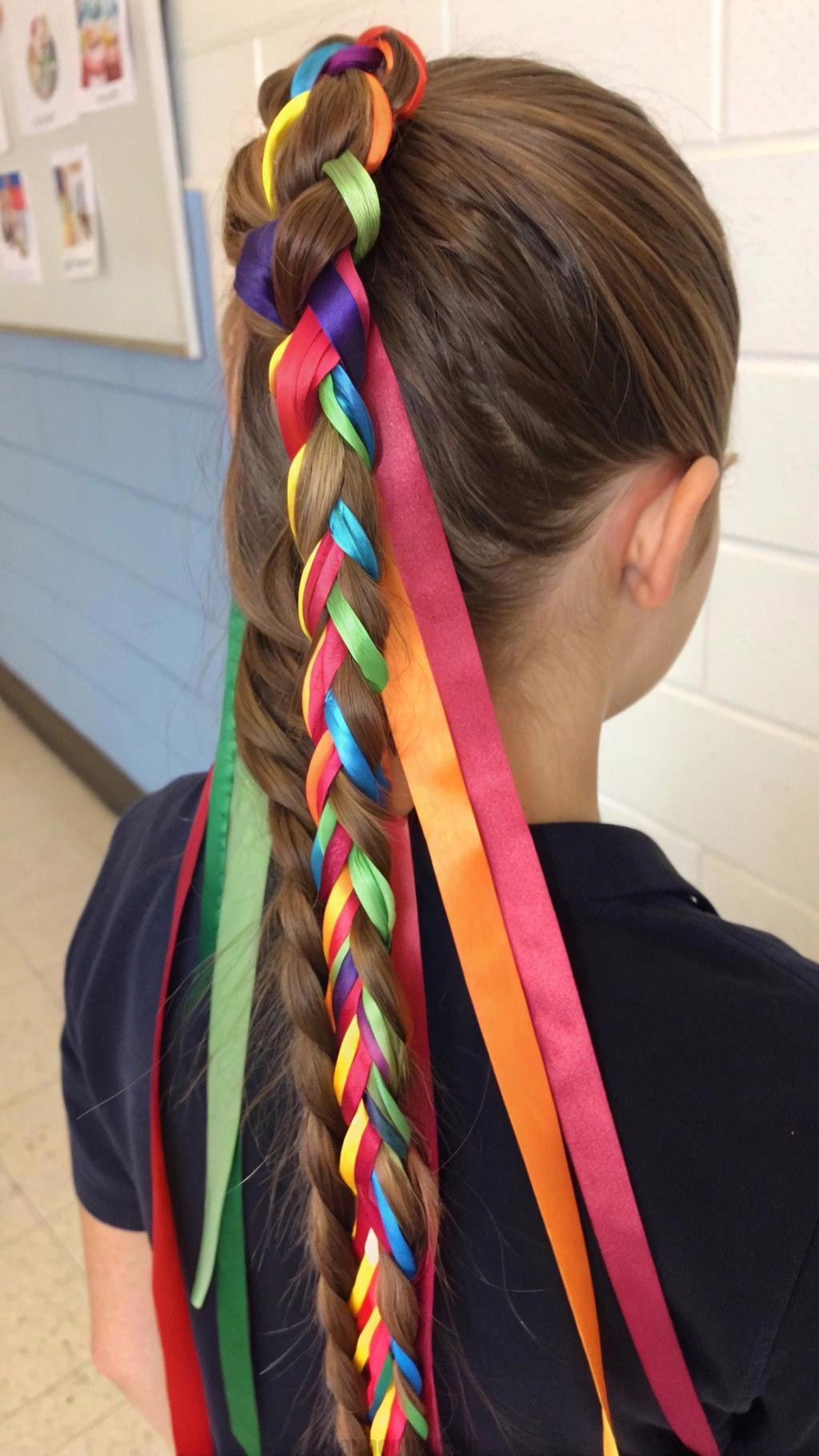 Colorful ribbons transform a basic braid. Choose a ribbon that matches your dress. Weave it through a standard three-strand braid.