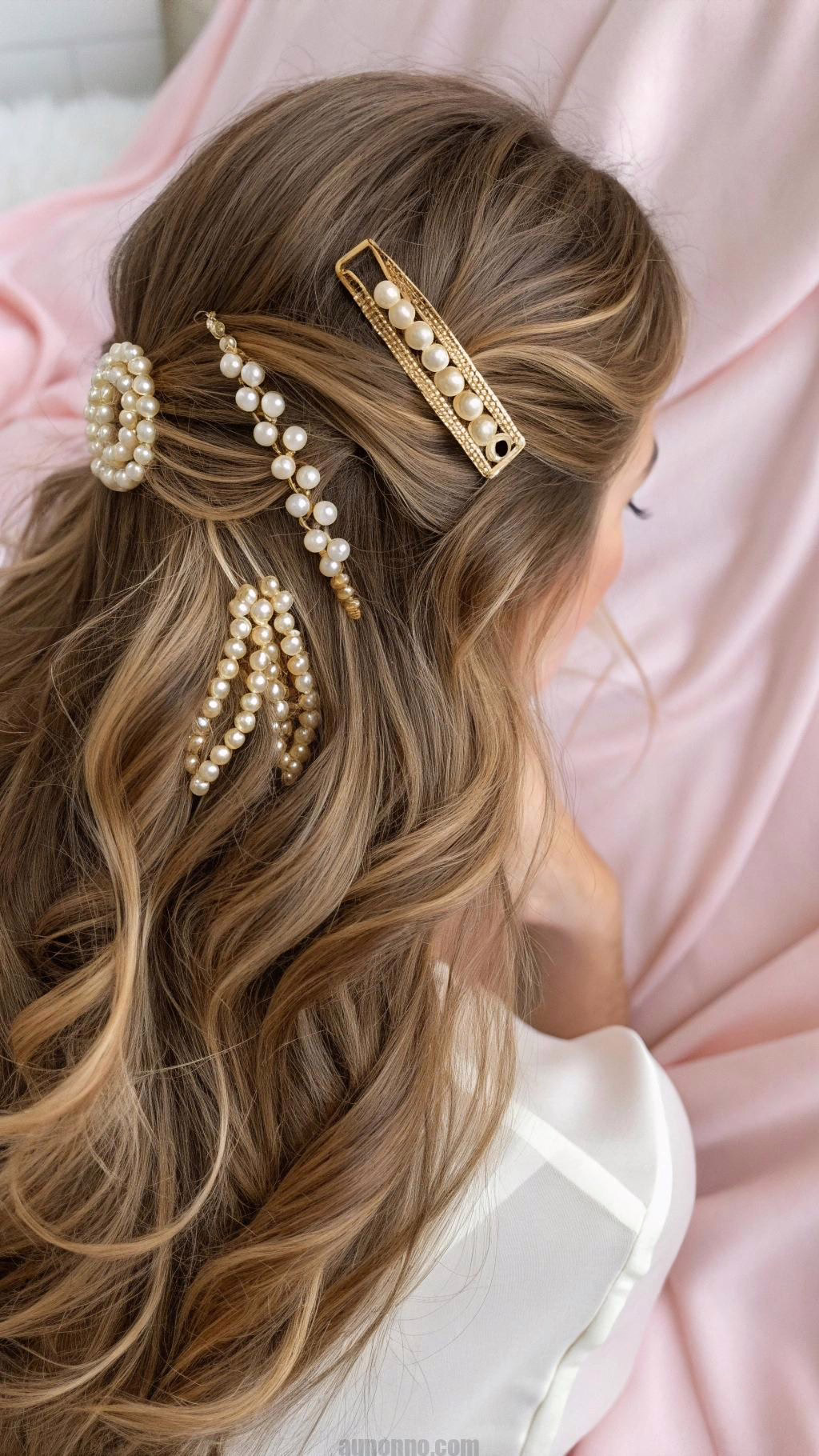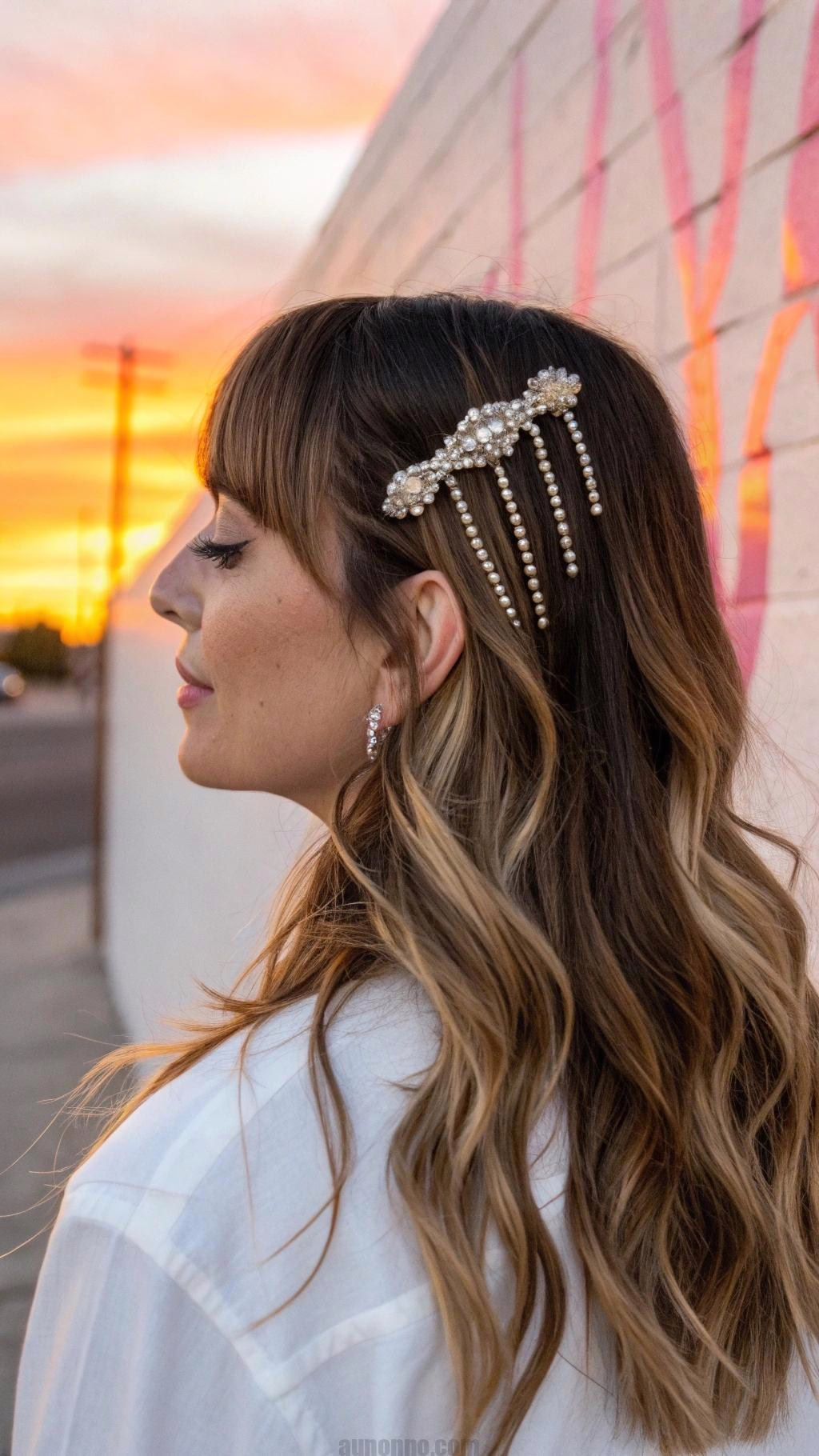 Show off your facial features with this look. Create soft waves throughout your hair. Use decorative pins to secure just the front sections back.