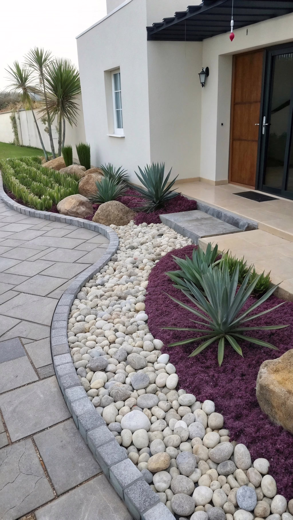 Rock gardens are low-maintenance and perfect for small front yard landscaping ideas. I often use a mix of smooth river rocks, pebbles, and larger boulders to create texture and depth. Adding drought-tolerant plants like sedum or cacti keeps the area lush without much water.