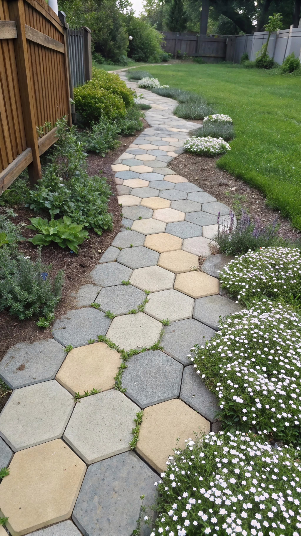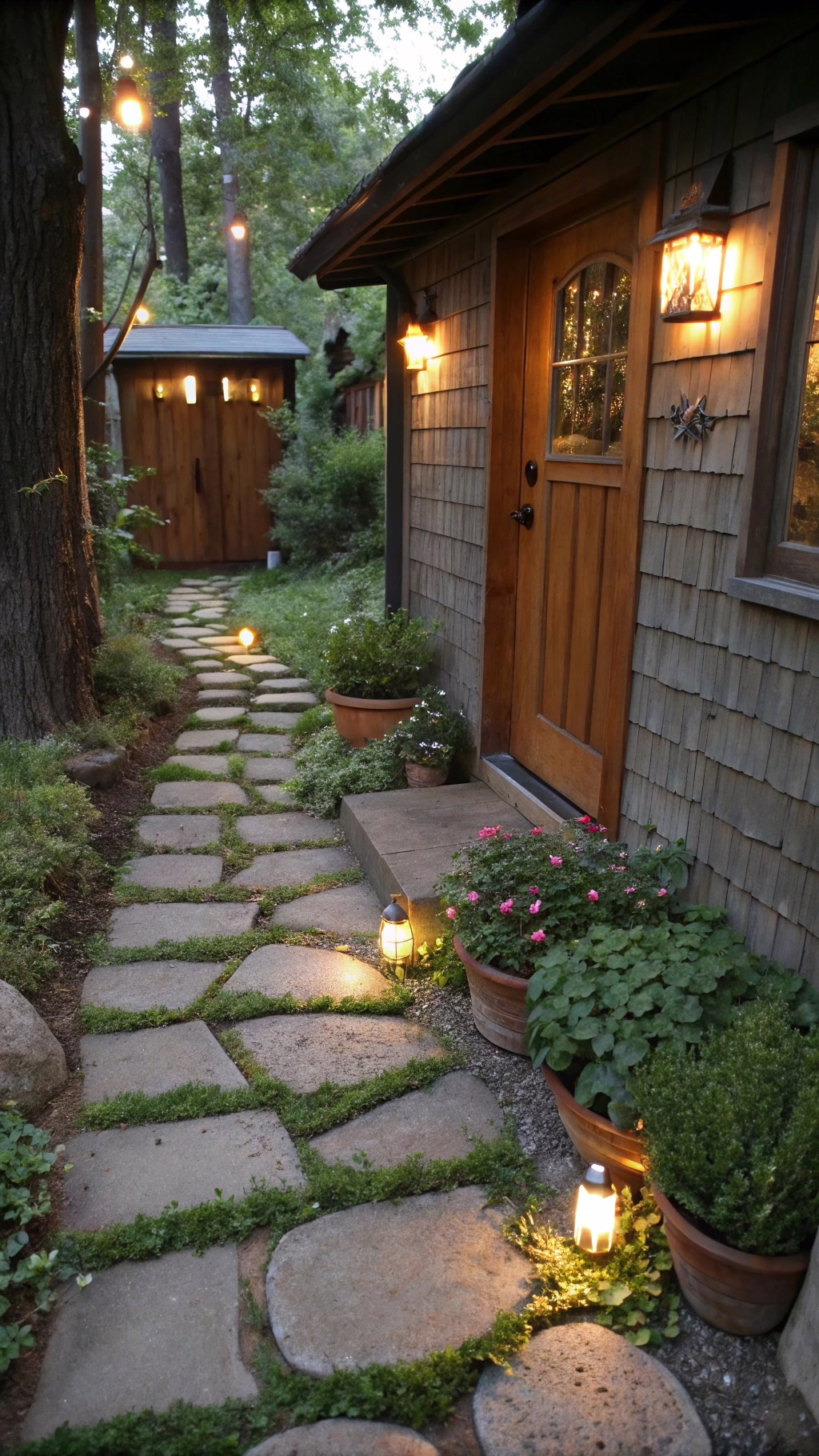 For this design, think about adding low-growing plants like thyme or creeping juniper between the stones. These plants soften the hardscape and add texture. You can also line the pathway with solar lights to create a warm glow at night. It’s an easy way to enhance both safety and aesthetics.
