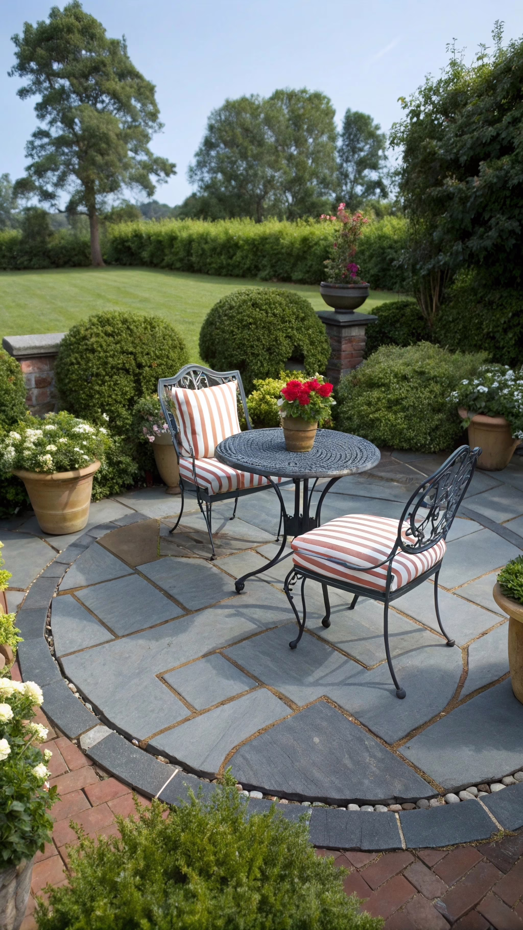 Mini patios are ideal for small front yard landscaping ideas, offering a dedicated space to relax. I use paving stones or flagstone to create a simple yet elegant surface. Adding a small table and chairs turns it into an outdoor dining area.