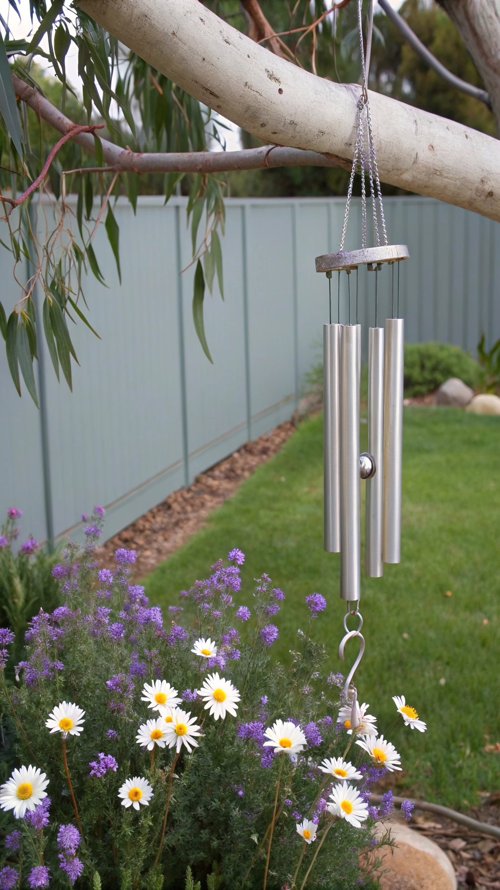 Wind chimes bring music and movement to small front yard landscaping ideas. I hang them from tree branches or porch ceilings where breezes can activate them. Their melodic tones add a sensory layer to your outdoor space.