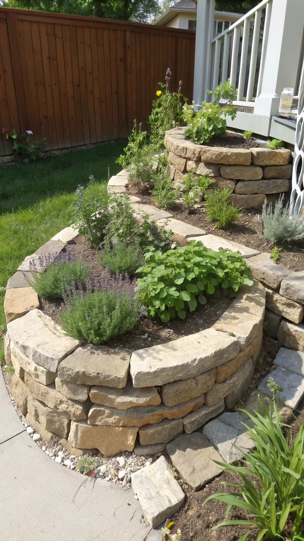 Herb spirals are practical and visually appealing for small front yard landscaping ideas. I build them using stacked stones or bricks in a spiral shape, which maximizes vertical space. Plant herbs like rosemary, thyme, and mint based on their sunlight needs within the spiral.