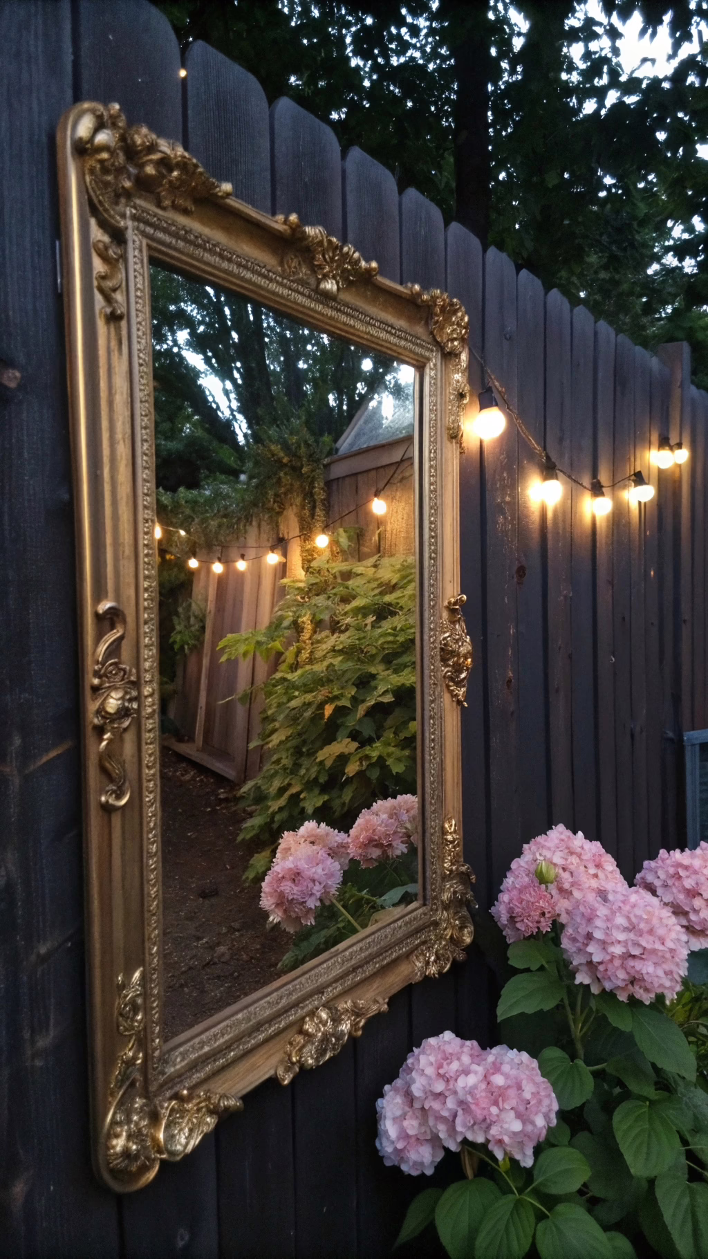 Position mirrors strategically to highlight specific features like flowers or pathways. Avoid placing them where they’ll reflect harsh sunlight directly onto seating areas. Pair them with climbing plants or fairy lights for added charm.
