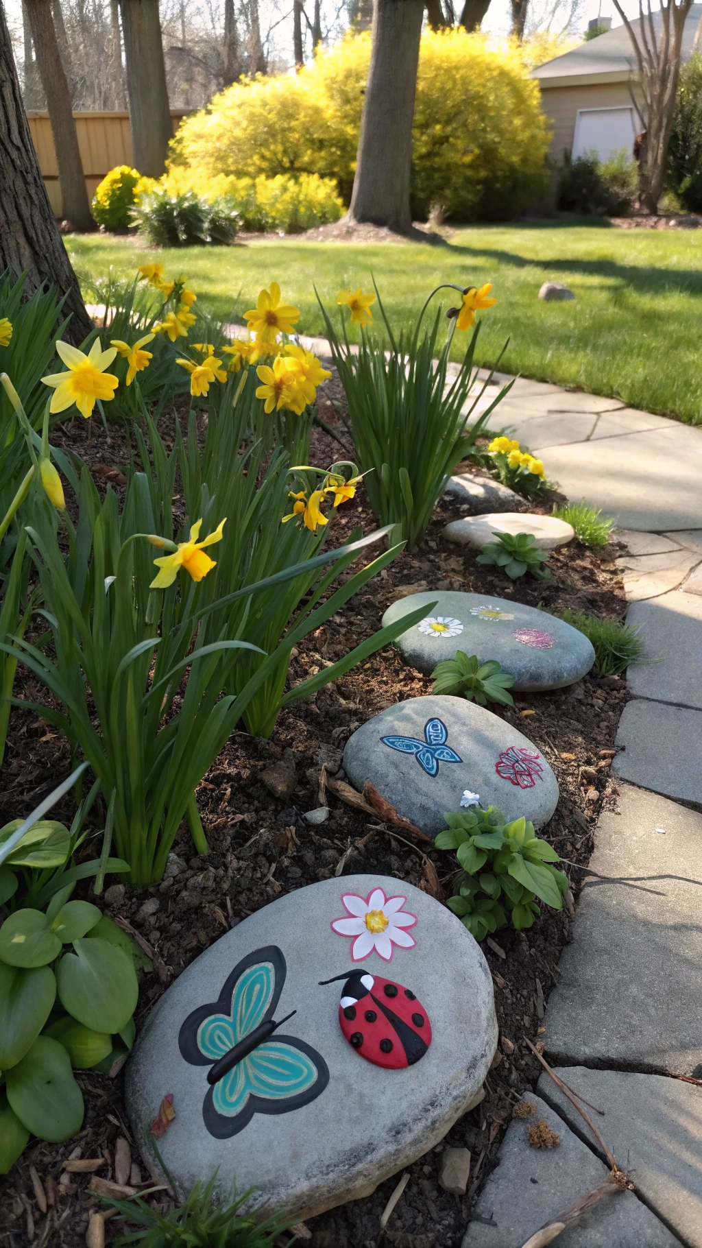 Choose stones in varying sizes and shapes for a natural look. Paint or stencil them yourself for a DIY touch. They’re durable, weather-resistant, and require zero maintenance.