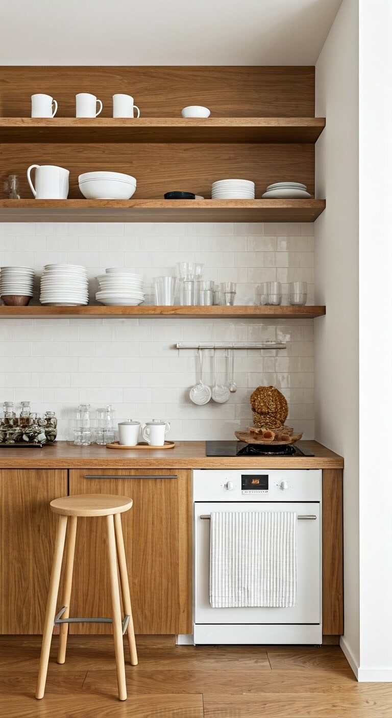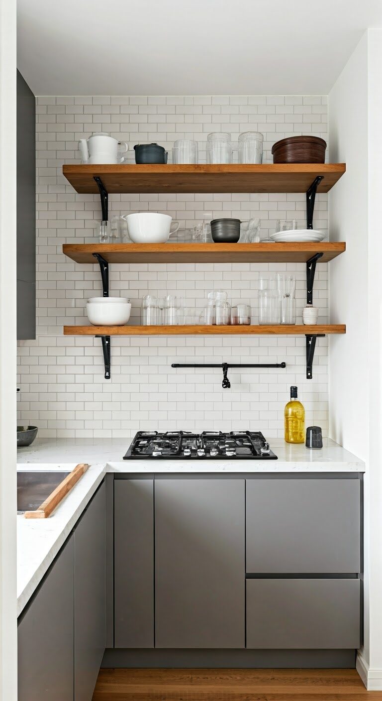 Open shelving is a fantastic small kitchen decor idea that combines functionality with aesthetics. It provides easy access to frequently used items while showcasing your favorite dishes or decor. Use floating shelves to save floor space and create a modern look. Arrange items neatly to avoid clutter and maintain a clean appearance. Open shelving also allows you to add personal touches, like plants or artwork. This versatile solution is perfect for maximizing storage in a small kitchen decor setup.