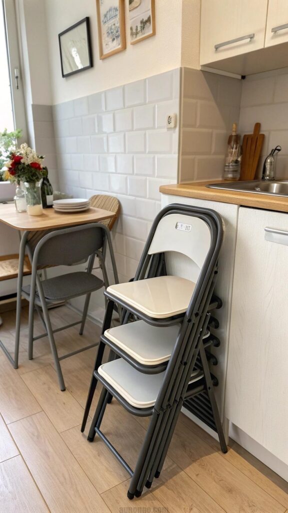 Foldable or stackable chairs are perfect for small kitchen decor. They save space when not in use and can be easily stored. Choose designs that match your kitchen’s aesthetic for a cohesive look. These chairs are ideal for small dining areas. They are a practical addition to any small kitchen decor plan.