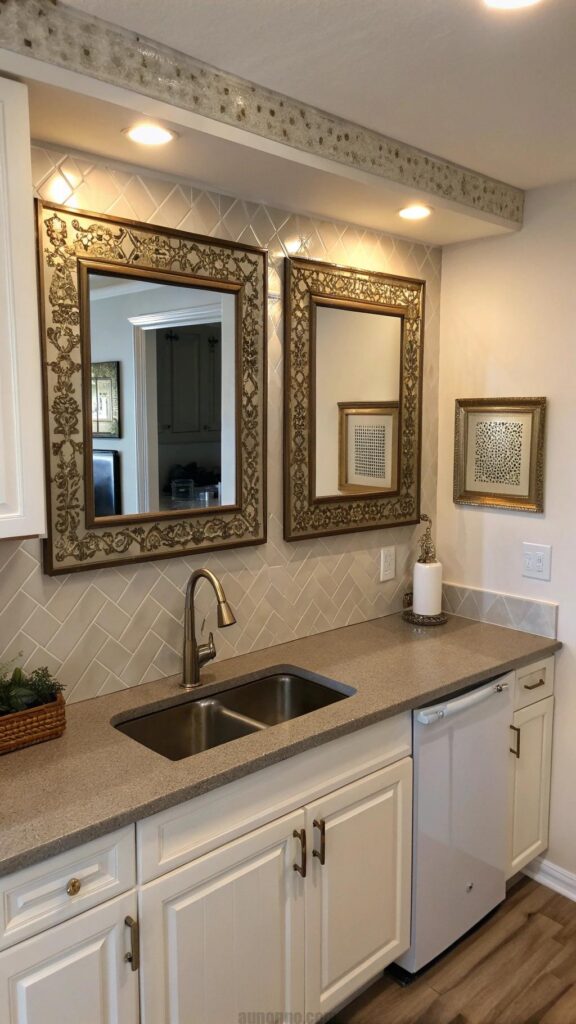 Mirrors are a clever addition to small kitchen decor. They reflect light and create the illusion of a larger space. Place a mirror on a backsplash or above a counter to brighten the area. Choose decorative frames that complement your kitchen’s style for an elegant touch. Mirrors can also make the room feel more open and inviting. This simple yet effective trick is perfect for enhancing small kitchen decor.