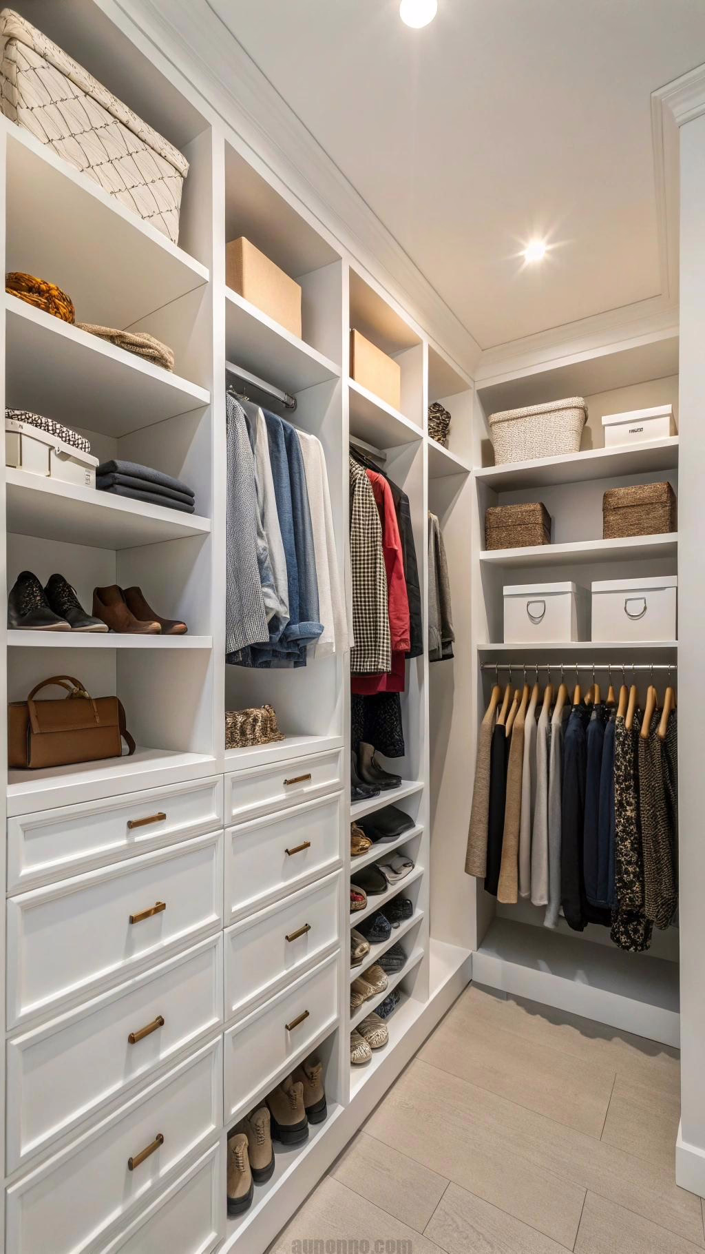 For boots and taller shoes, I installed custom cubbies along the bottom of the wall. This mixed storage approach accommodates my entire shoe collection in my small walk in closet while creating a visually appealing display that feels like a high-end boutique.