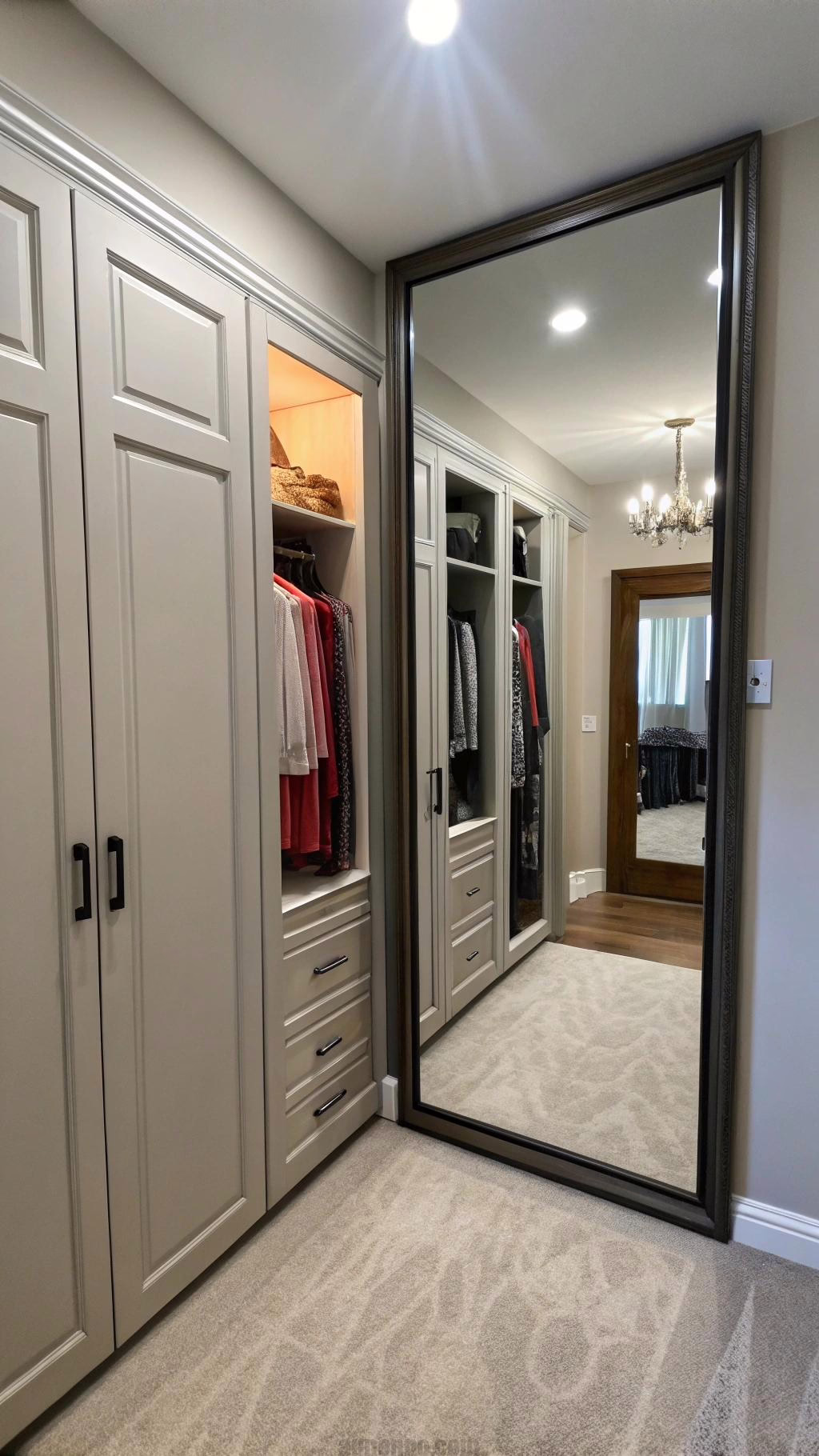 I transformed my small walk in closet by installing a full-length mirror on the back of the door. The mirror not only serves its practical purpose but also creates an illusion of doubled space that makes my closet feel significantly larger.