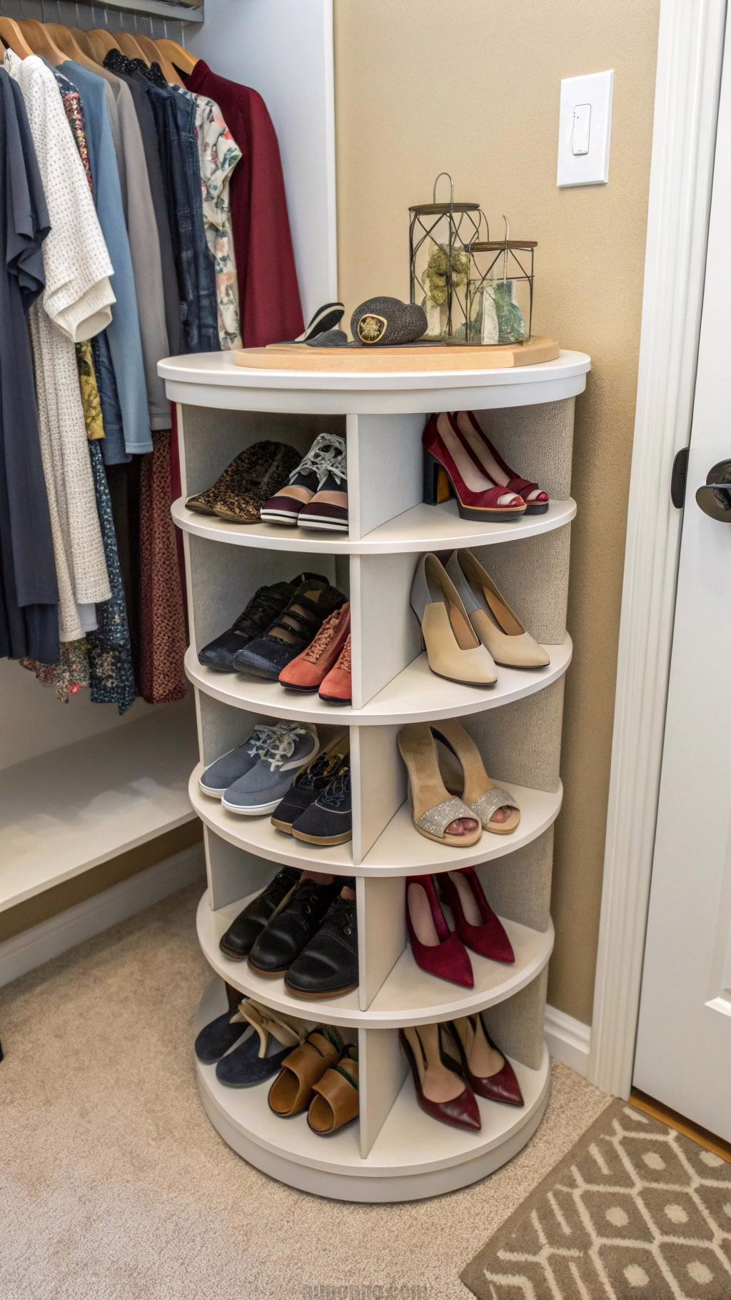 I turned the dead corner space in my small walk in closet into a productive storage area with a rotating shoe carousel. This lazy-susan style rack spins for easy access to all pairs while utilizing space that traditional rectangular shelving couldn’t effectively use.