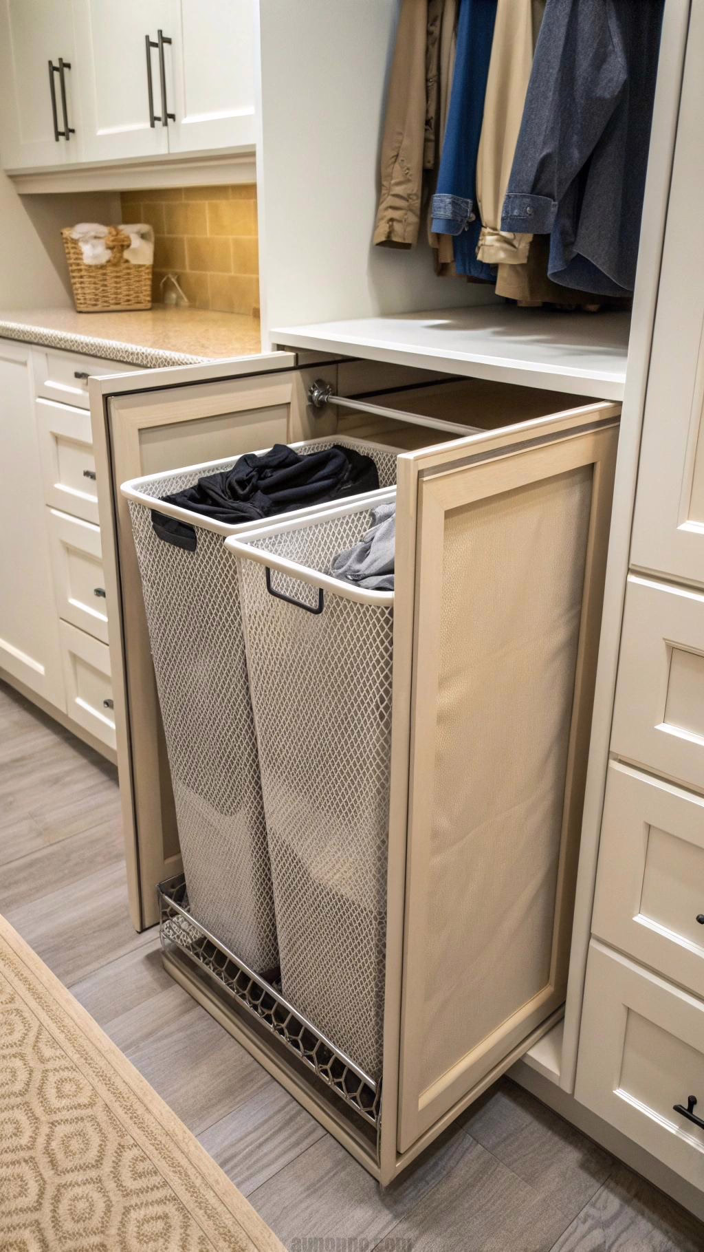 I incorporated a pull-out hamper cabinet that keeps laundry hidden yet accessible in my small walk in closet. The ventilated design prevents odors while maintaining a clean aesthetic that doesn’t detract from the overall organization of the space.