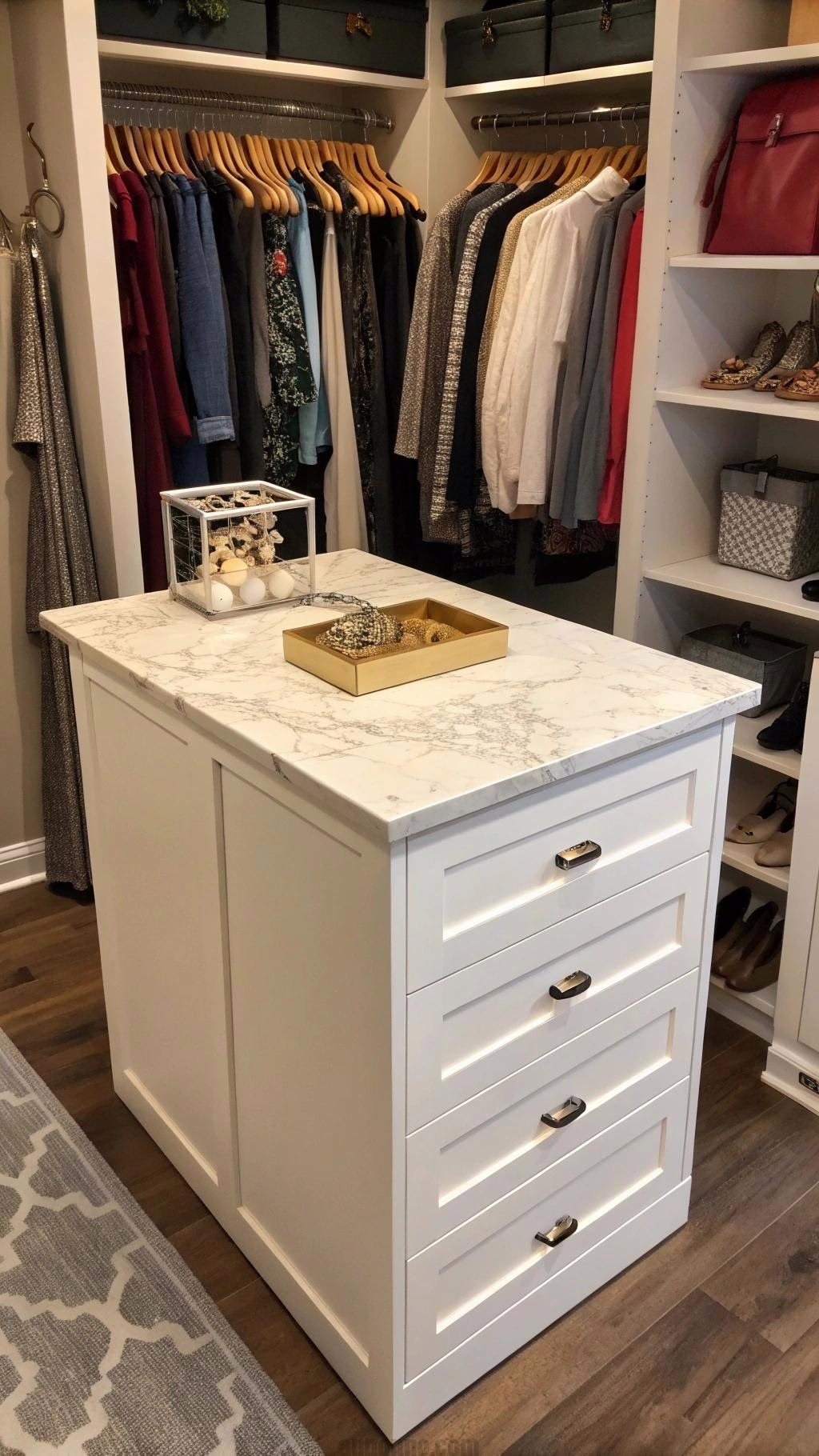 I incorporated a small island with drawers into my walk in closet that serves as both storage and a folding station. The counter space has become invaluable for outfit planning and accessorizing, while the drawers hold items that don’t hang well.