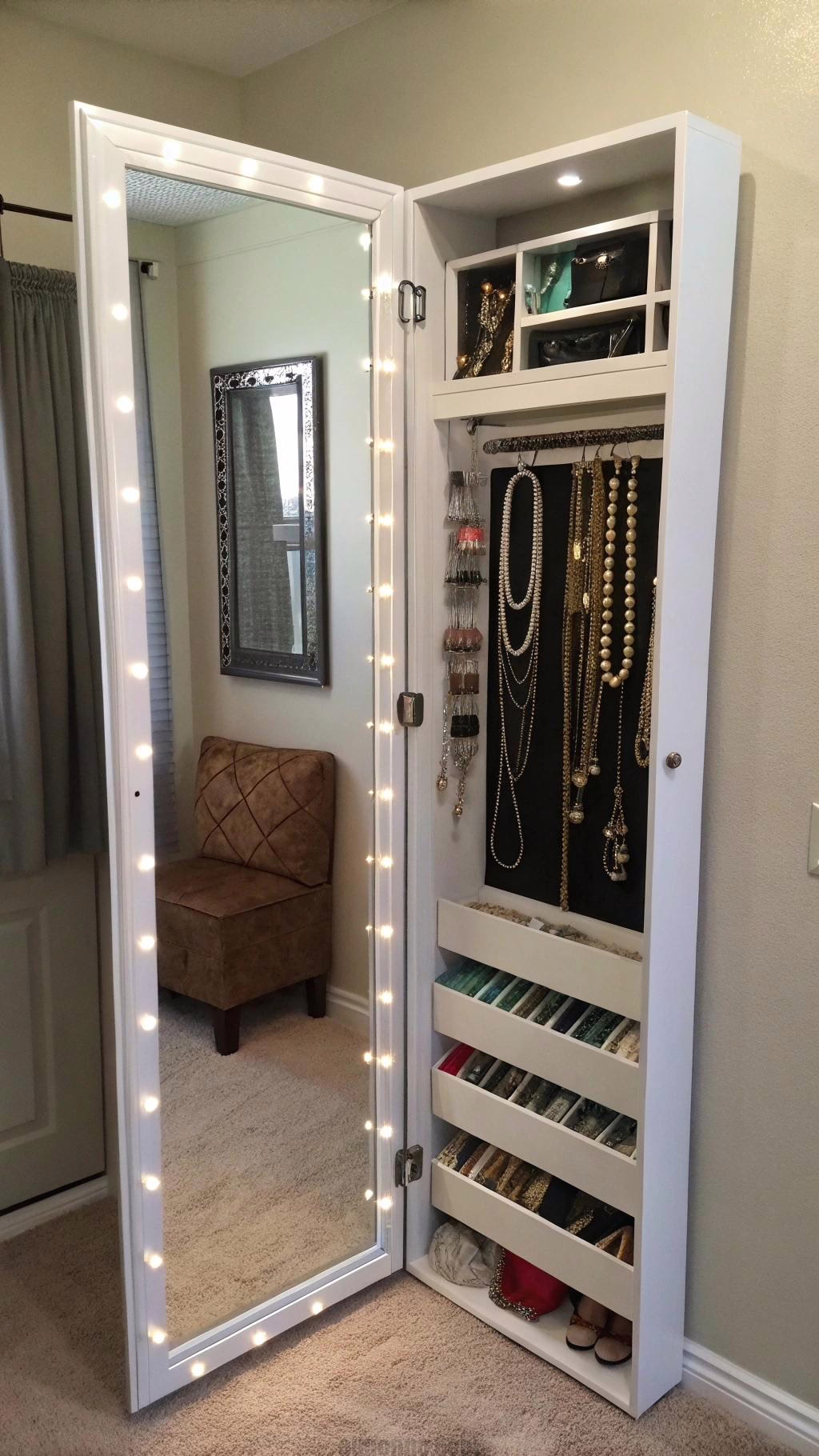 I mounted a full-length mirror with a hidden jewelry cabinet on an unused wall section in my small walk in closet. The slim profile provides massive storage for earrings, necklaces, and bracelets without consuming valuable drawer or shelf space.