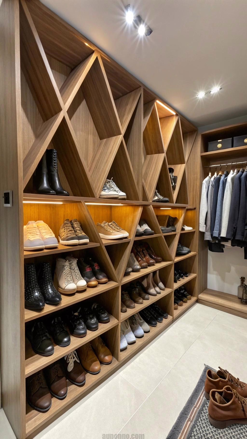 I created a dedicated shoe wall using angled shelving that displays my collection while saving significant floor space. The angled design allows me to see each pair at a glance without digging through stacks or boxes that previously cluttered my small walk in closet.