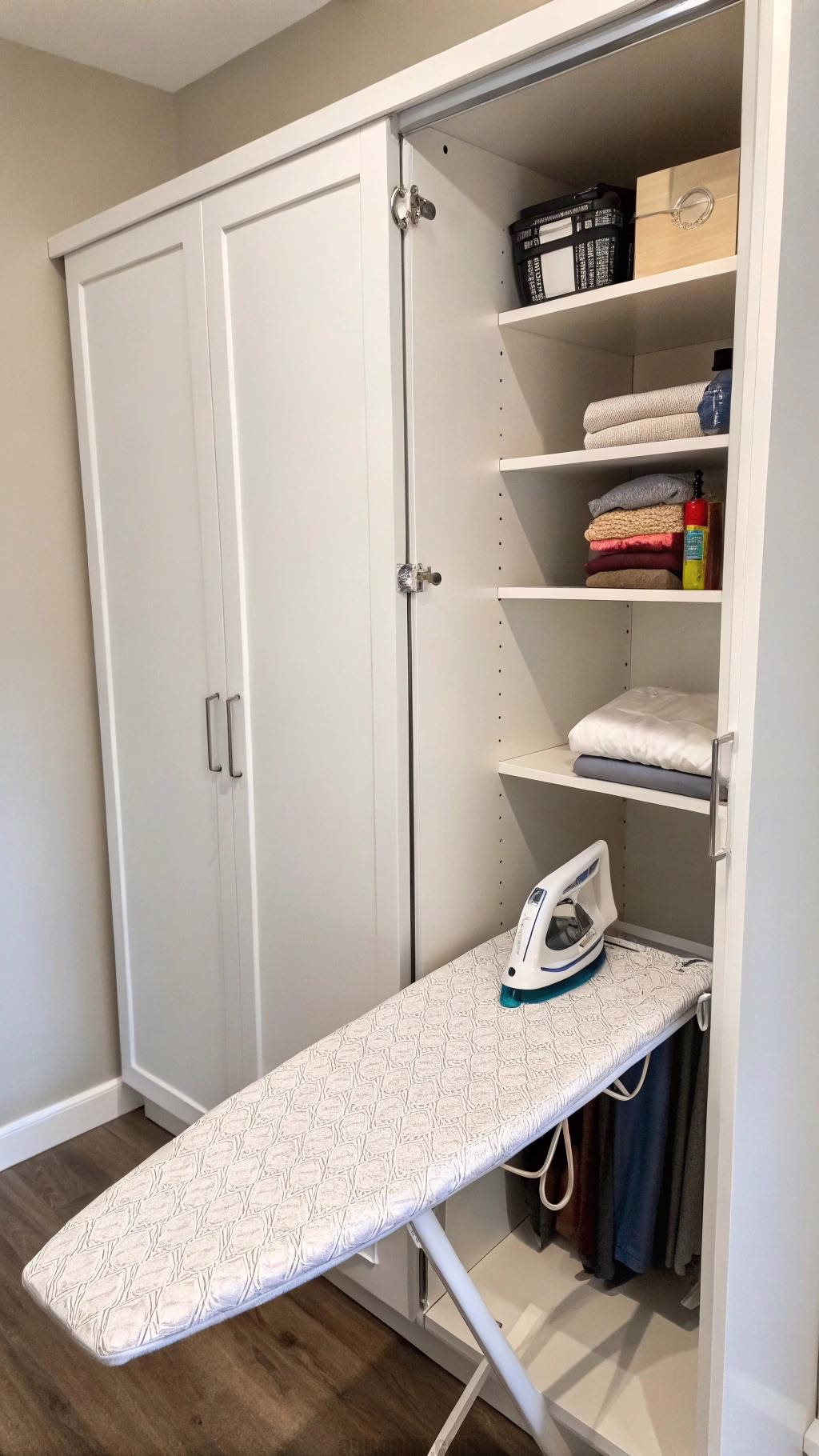 The cabinet housing the ironing board also contains a small steamer and iron, creating a complete garment care station. This compact solution has improved my wardrobe maintenance routine while maintaining the streamlined aesthetic of my small walk in closet.