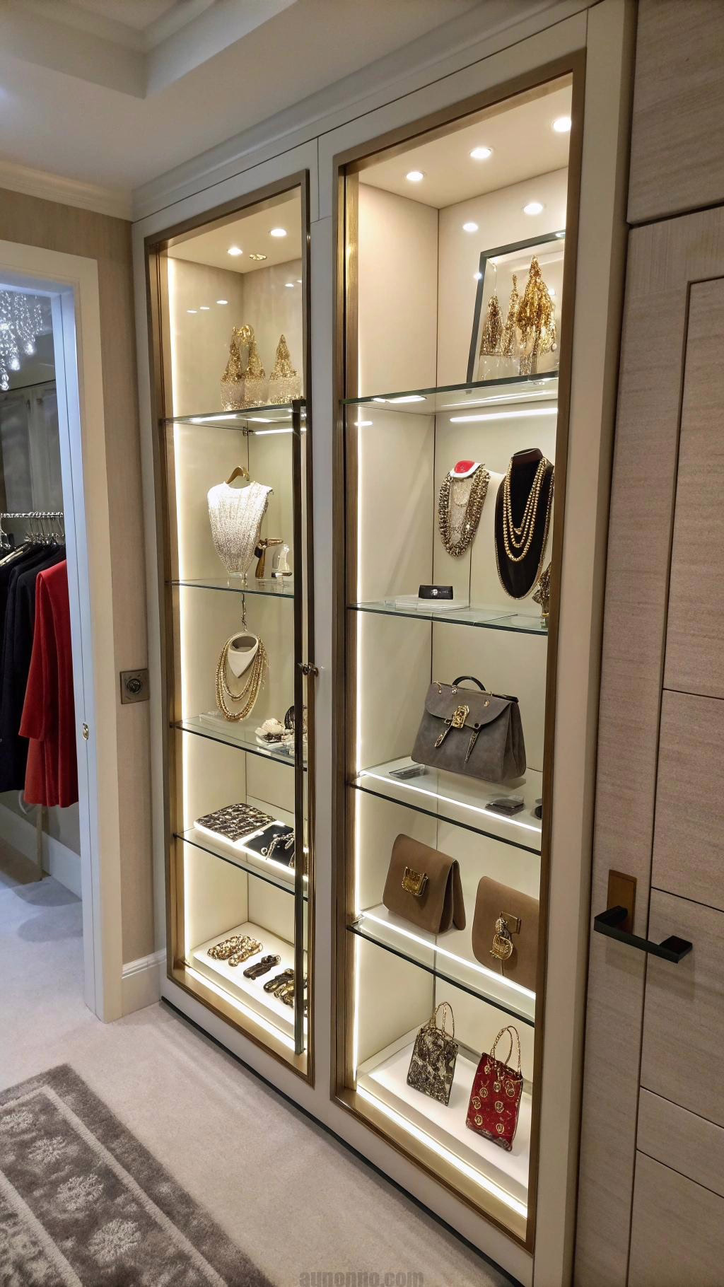 The interior LED lighting illuminates my jewelry collection while the mirror serves double duty for outfit checking. This space-efficient solution keeps accessories organized and tangle-free while contributing to the functionality of my small walk in closet.