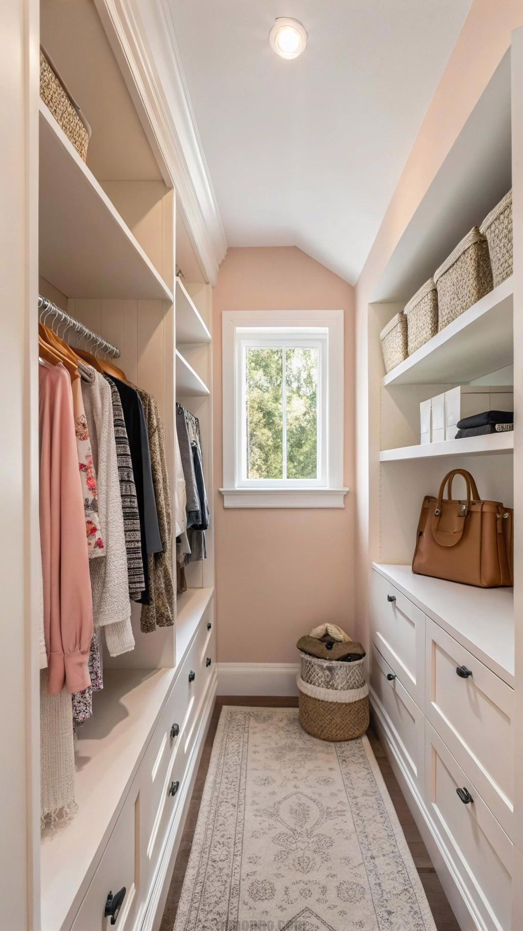 For added dimension, I incorporated a subtle accent wall in pale blush that adds interest without overwhelming the small area. This strategic color choice maintains the spacious feeling while giving my small walk in closet a boutique-like atmosphere that makes getting dressed a pleasure.