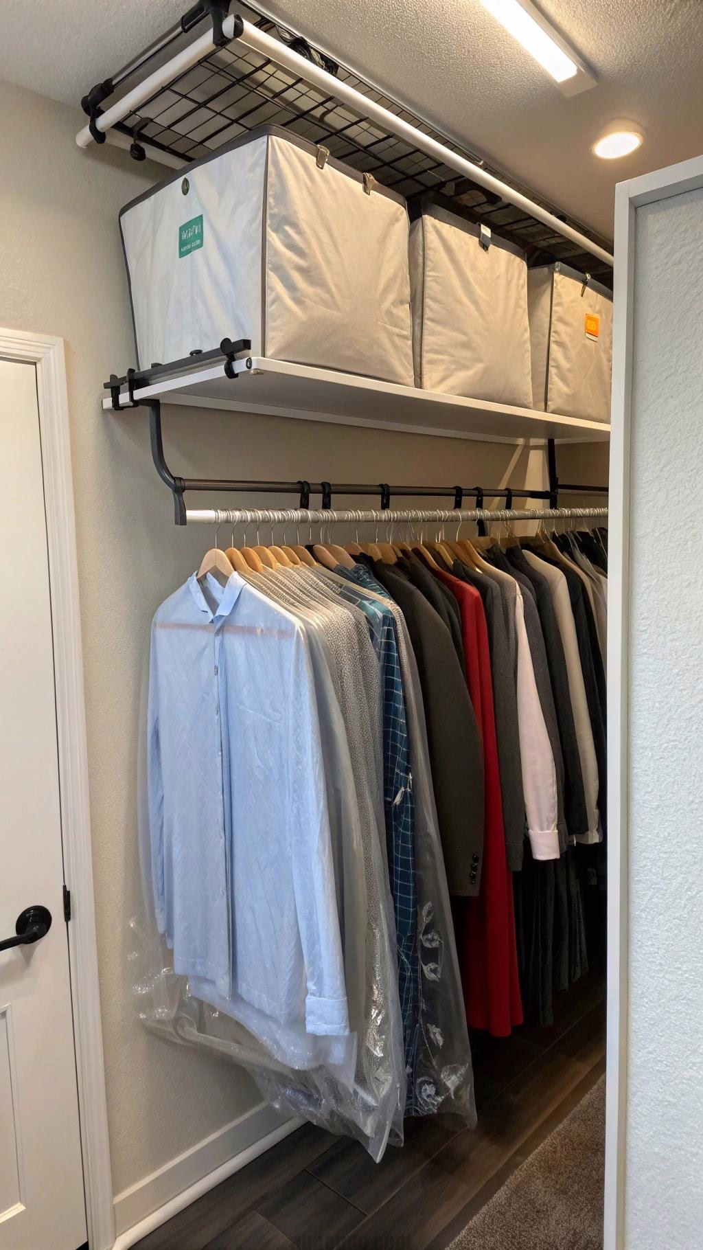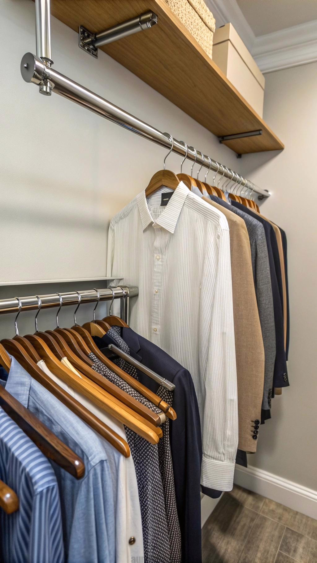I revolutionized my small walk in closet by installing a double-rod hanging system that instantly doubled my hanging capacity. Shorter items like shirts and folded pants hang on the top rod while longer dresses and coats occupy the bottom rod, maximizing vertical space.