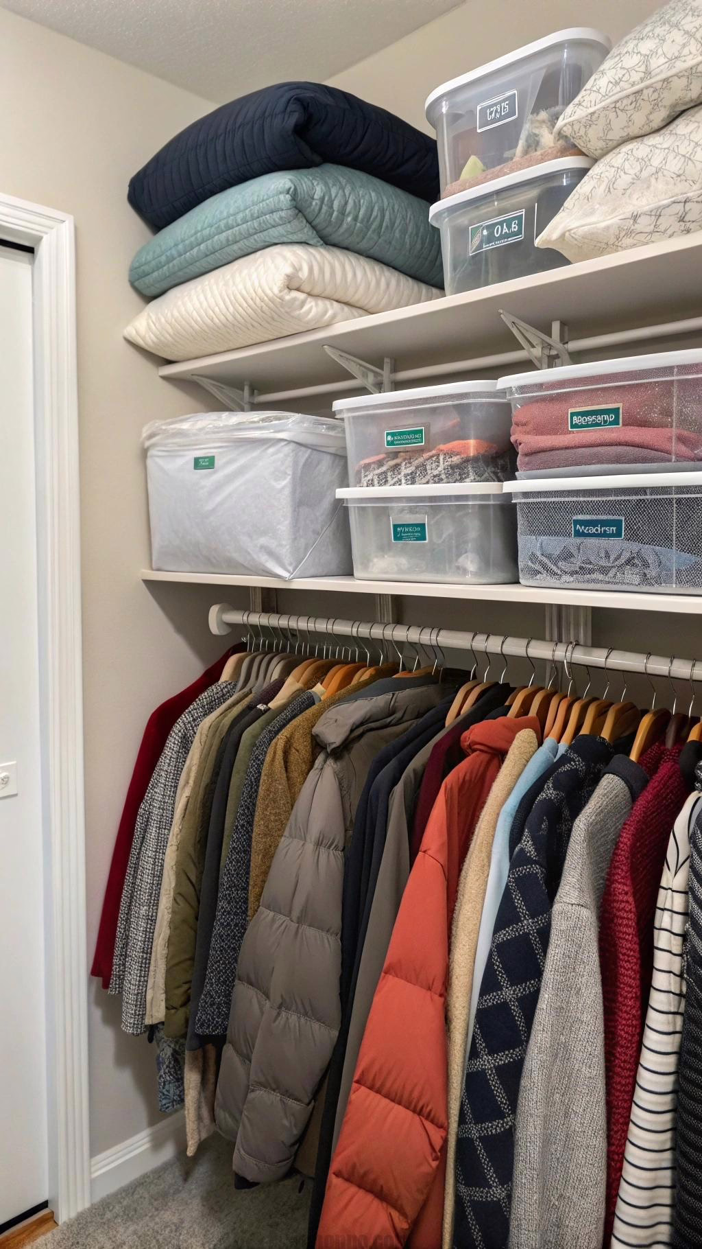 I implemented a seasonal rotation system in my small walk in closet using vacuum-sealed bags for off-season items. These compressed packages take up minimal space on my upper shelves, keeping winter coats and sweaters out of the way during summer months.