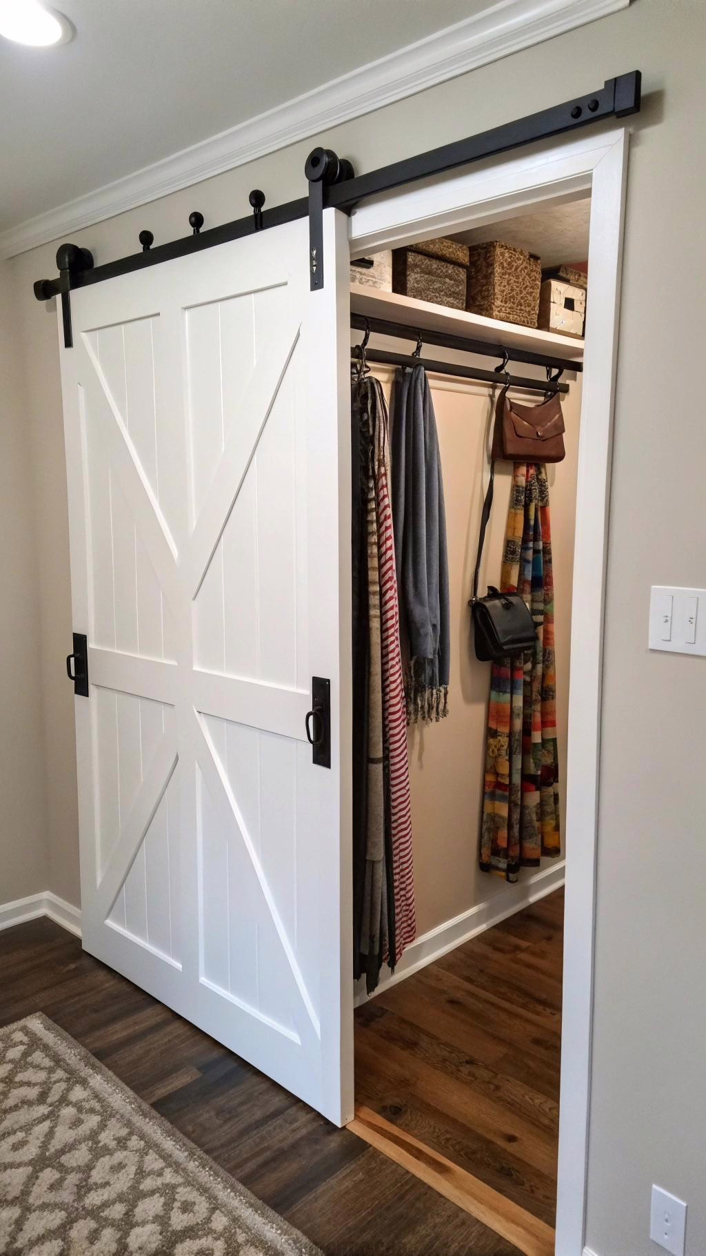 I replaced my swinging closet door with a sliding barn-style door that doesn’t require clearance space to open. This simple change freed up several square feet of floor and wall space that I now use for additional storage in my small walk in closet area.