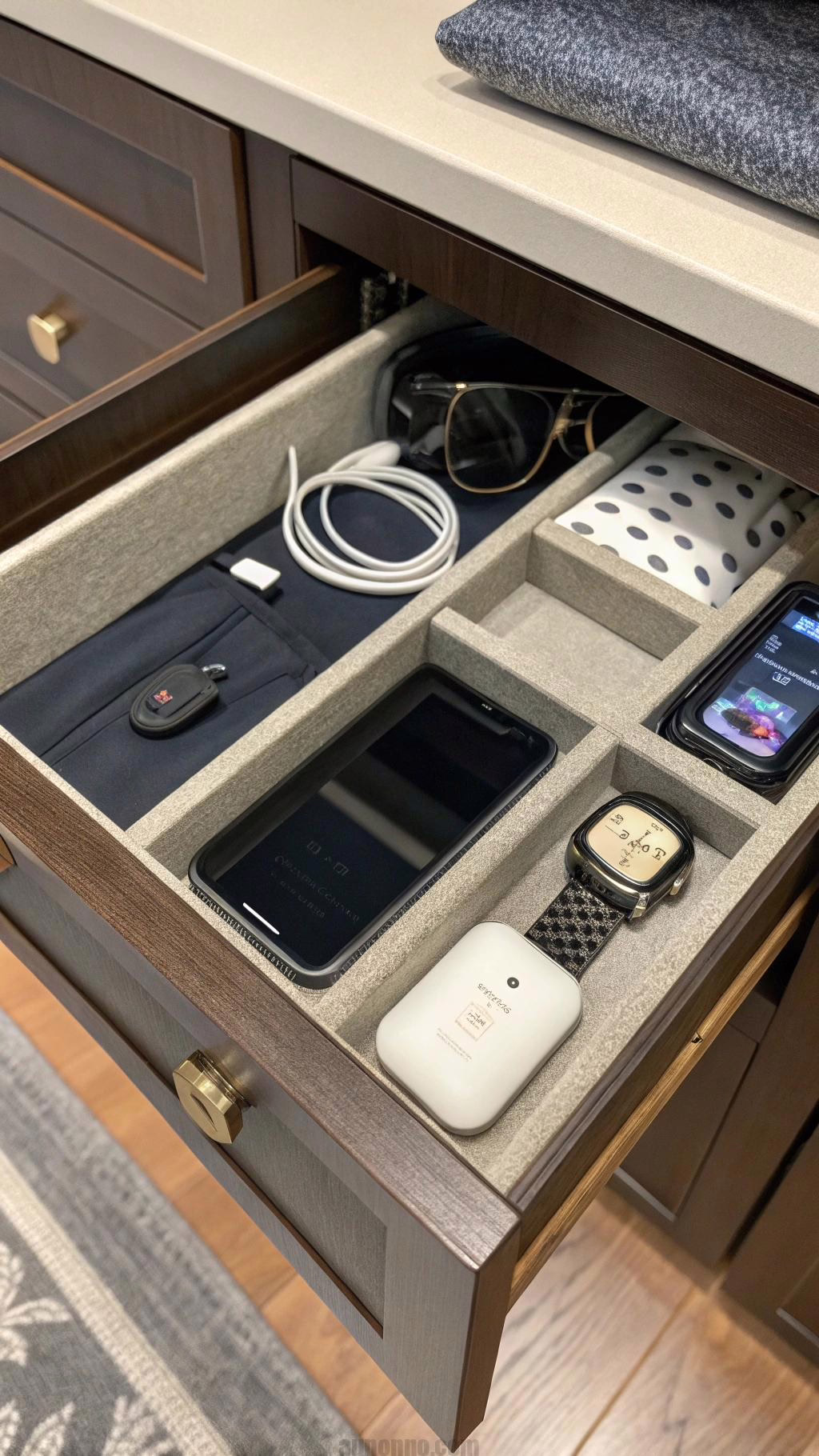 I incorporated a discreet charging drawer in my small walk in closet cabinetry for storing and powering devices overnight. This dedicated space keeps electronics organized and cords hidden while still providing the power needed for my smartwatch, phone, and other accessories.