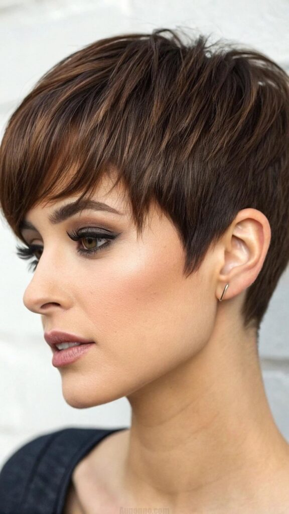This bold hairstyle combines a short, layered pixie cut with micro bangs for a daring and modern look. The layers add texture and volume to the short hair, while the micro bangs create a striking focal point. It’s a great choice for those who want to make a statement.