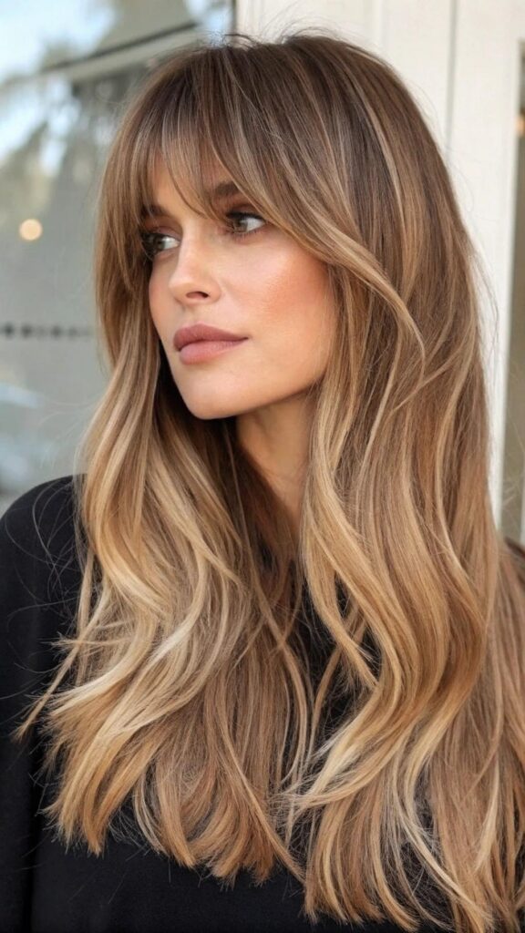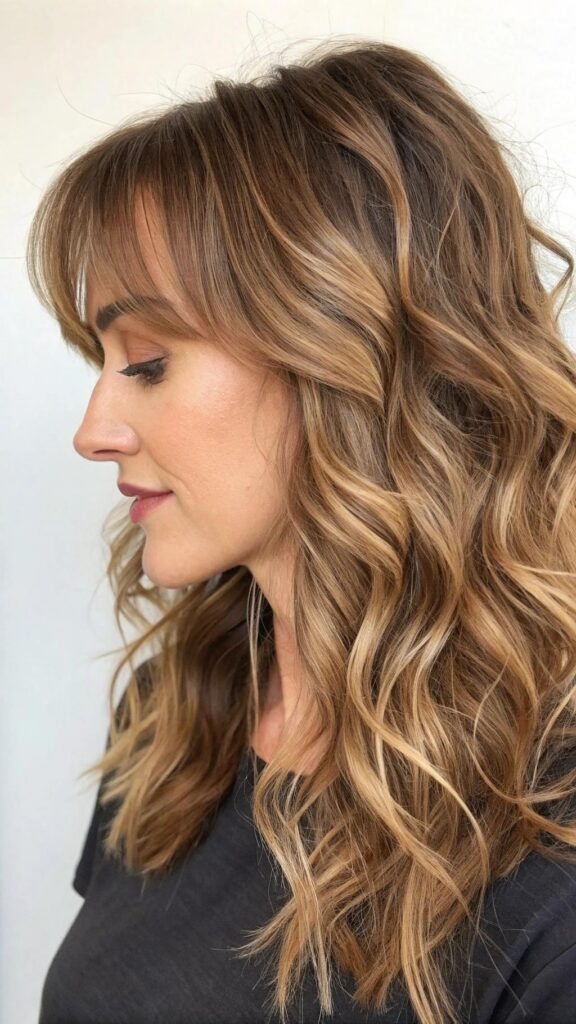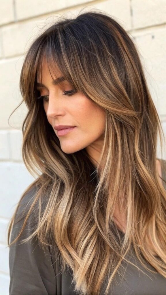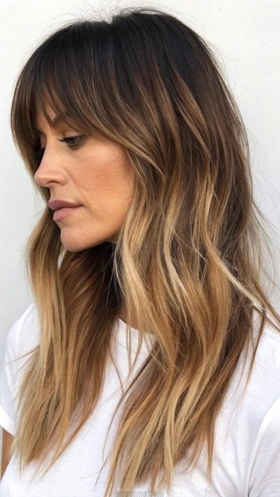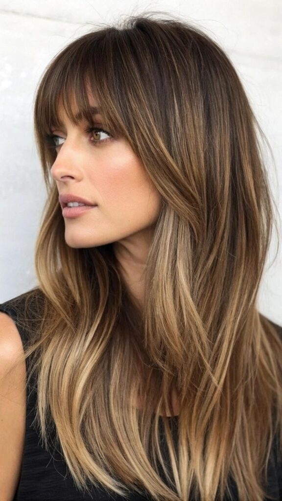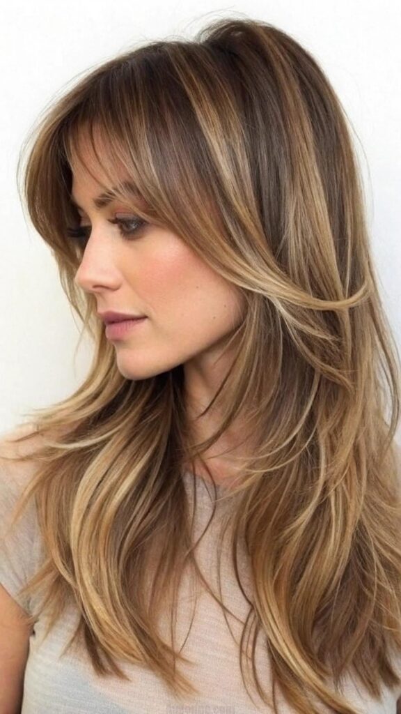 The side bangs are swept to one side, blending seamlessly with the layers. This style works well for medium to long hair and is particularly flattering for round and oval faces. The balayage highlights are painted onto the hair to enhance the layers and bangs, creating a seamless blend of colors.