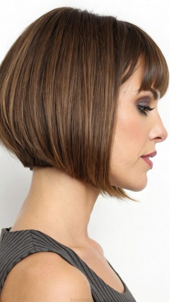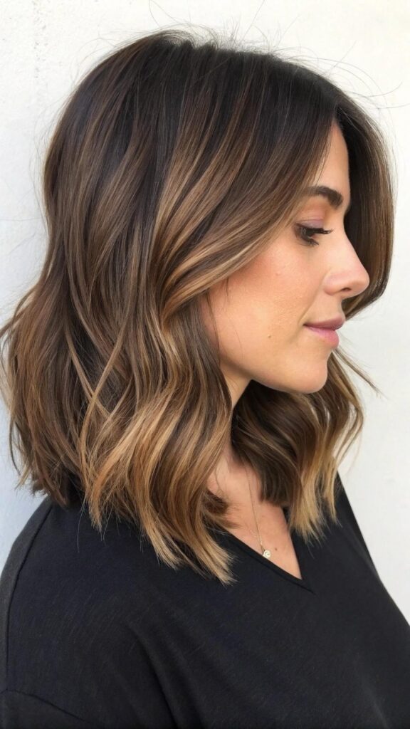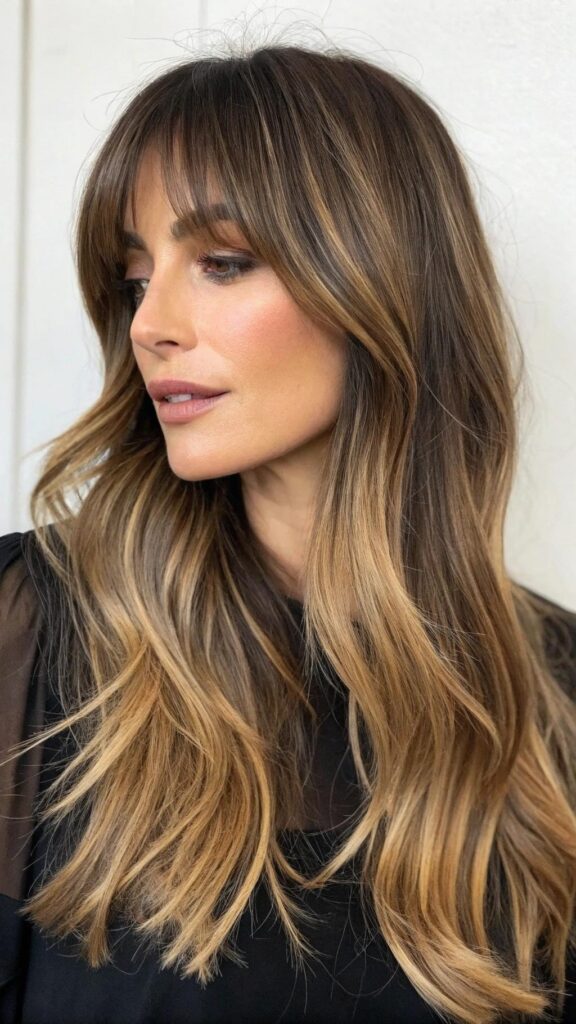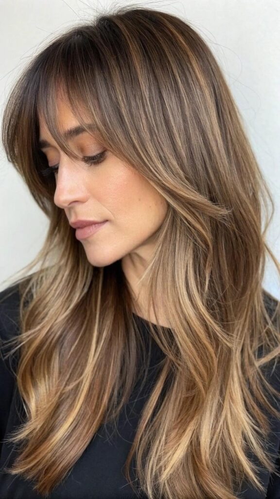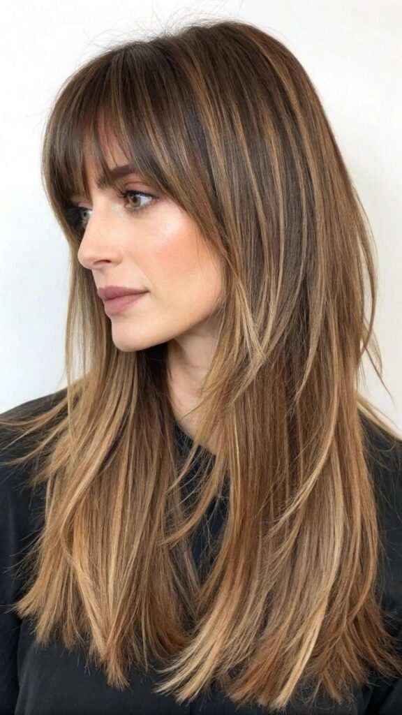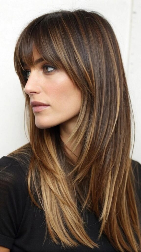 The side bangs are cut straight across the forehead, drawing attention to the eyes. This style works well for medium to long hair and is particularly flattering for oval and square faces. The lowlights are strategically placed to enhance the layers and bangs, giving the hair a multi-dimensional effect.