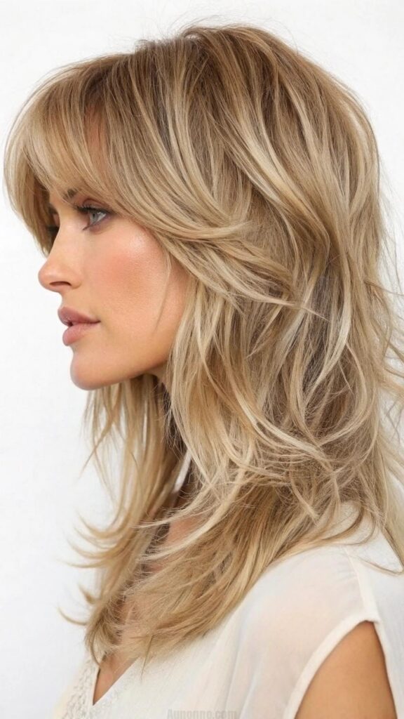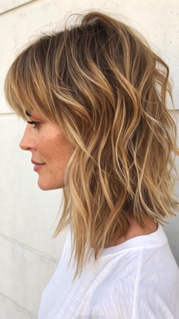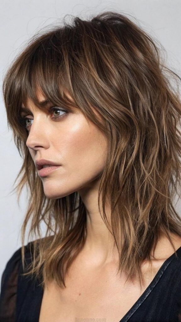 This hairstyle is all about effortless texture and a carefree vibe. The shaggy layers are cut to create a tousled, lived-in look, while the wispy bangs add a soft, feminine touch. It’s perfect for those who want a low-maintenance yet stylish haircut.