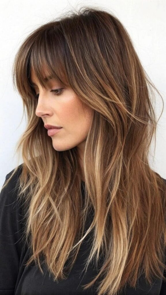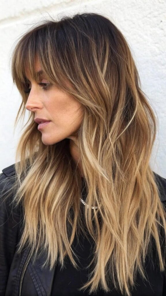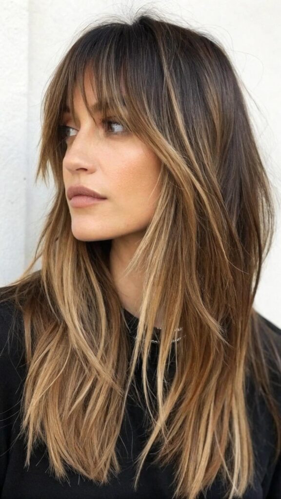 The choppy bangs are cut to be uneven and textured, adding to the edgy vibe. This style works well for medium to long hair and is particularly flattering for oval and square faces. The balayage highlights are painted onto the hair to enhance the layers and bangs, creating a seamless blend of colors.