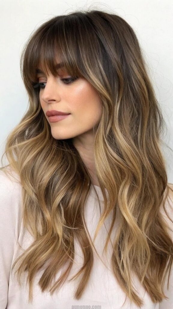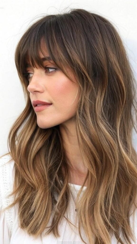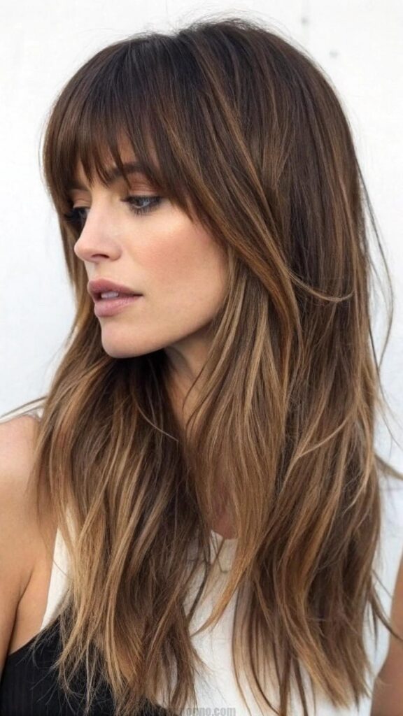 This hairstyle combines long, flowing layers with wispy curtain bangs for a soft and romantic look. The layers add movement and dimension to the hair, while the curtain bangs frame the face beautifully. It’s a versatile style that suits almost any occasion.
