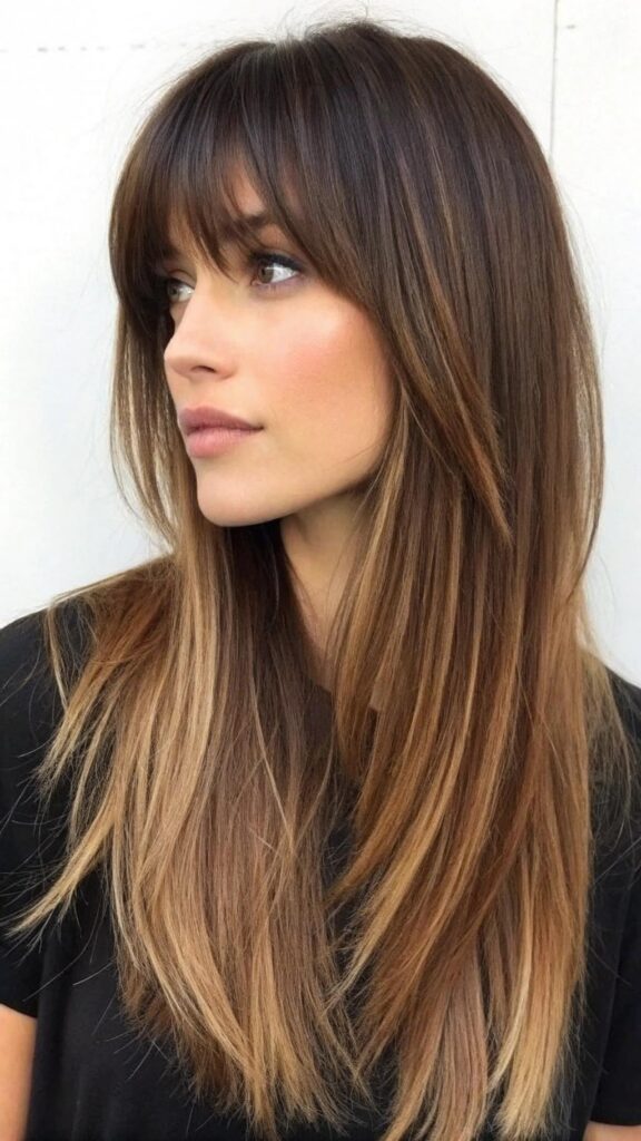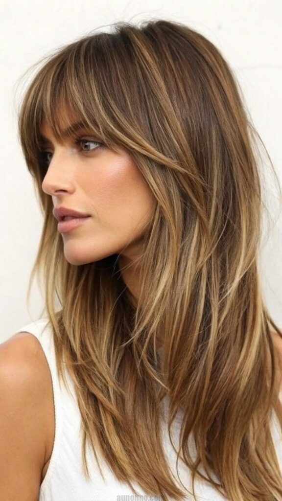 The blunt bangs draw attention to your eyes and balance the length of the layers. This style works best for straight hair and requires regular trimming to maintain its sharpness. It’s a low-maintenance look that still makes a statement.