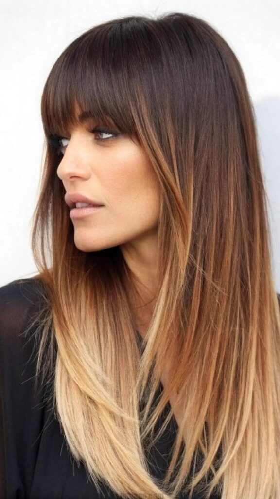 This hairstyle features long, layered hair with blunt full bangs and ombre coloring for a bold and modern look. The layers add texture and movement, while the blunt bangs create a striking focal point. The ombre effect transitions from dark roots to lighter ends, adding depth and dimension to the hair.