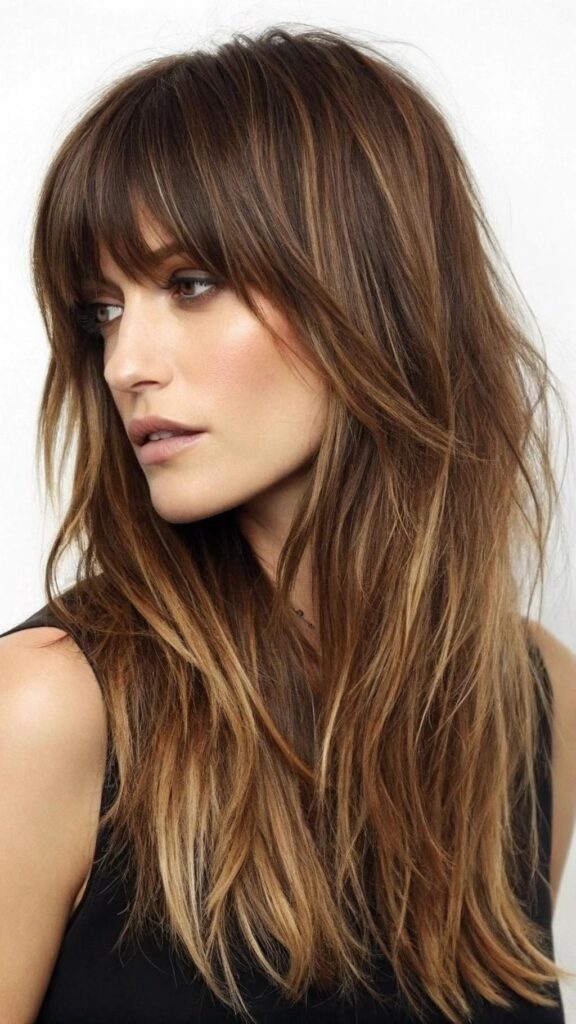 The full bangs are cut to be uneven and textured, adding to the edgy vibe. This style works well for medium to long hair and is particularly flattering for oval and square faces. The lowlights are strategically placed to enhance the layers and bangs, giving the hair a multi-dimensional effect.