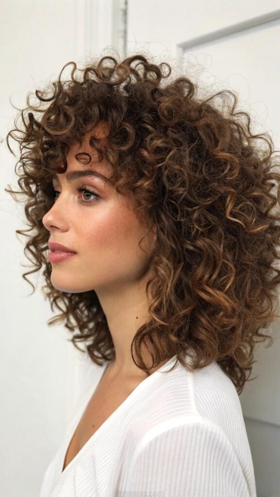 This hairstyle showcases beautiful, curly layers paired with full bangs. The layers enhance the natural curl pattern, adding volume and bounce to the hair. The full bangs create a bold and playful look, perfect for those who want to stand out.