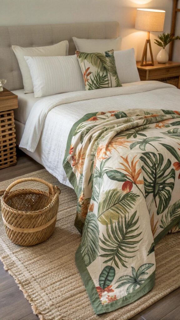 Use tropical accents like wall art, a few plants, or a single bold print. Keep the rest of the decor simple to avoid overwhelming the space.