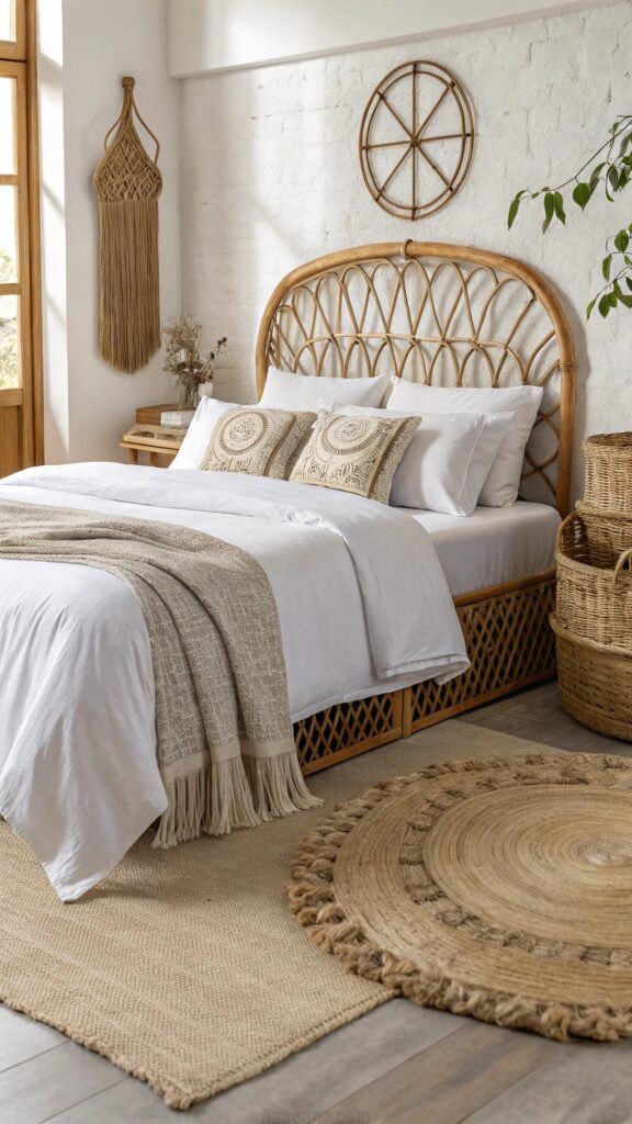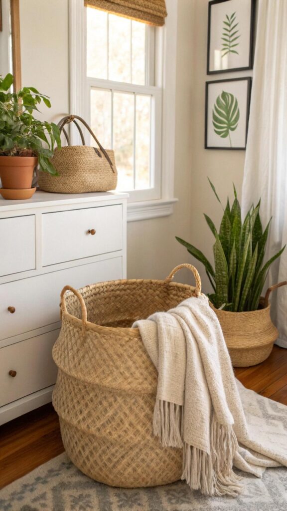 Incorporate natural fiber baskets for storage and decor. Use them to hold blankets, pillows, or plants. These baskets add texture and functionality to your bedroom.