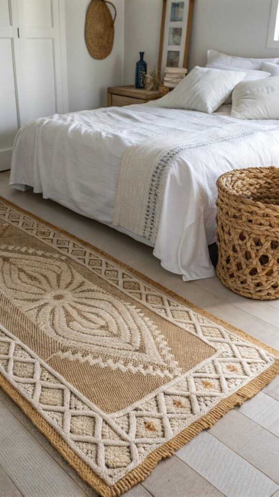 Add depth and texture to your bedroom with layered rugs. Place a smaller patterned rug on top of a larger neutral one. This creates a cozy, layered effect that’s perfect for summer.