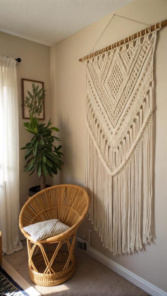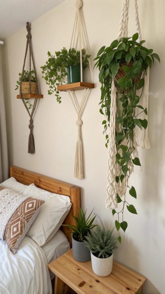 Add a bohemian touch to your bedroom with macrame decor. A macrame wall hanging or plant hanger brings texture and warmth to your space. This handmade element adds a personal, artisanal feel.